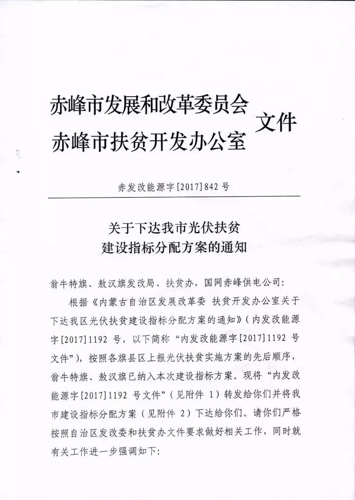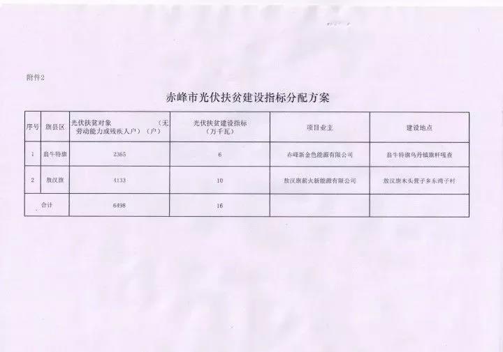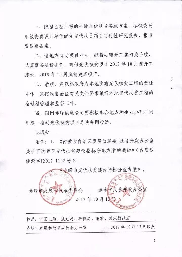 10月13日,赤峰市发改委、扶贫办联合发文,下达赤峰市2017年160MW瓦光伏扶贫建设指标分配方案,通威新能源有限公司获得敖汉旗100MW光伏扶贫指标,另外60MW光伏扶贫指标被赤峰新金色能源有限公司获得。
