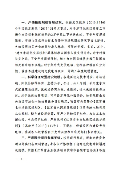 合规原则。项目布局要符合《江苏省主体功能区规划》、《江苏省电网发展规划》以及当地土地利用总体规划、城乡建设规划等。要严守耕地保护红线、永久基本农田红线、生态保护红线,不得在一线管控区内建设光伏电站,需要在二级管控区开发的必须征求有关部门书面意见。