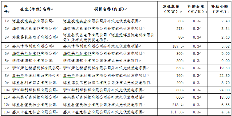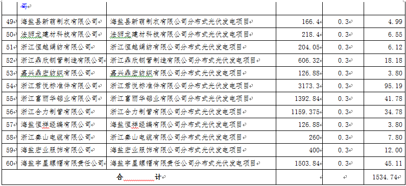 为促进我县光伏产业健康发展,根据《海盐县人民政府关于印发2016年海盐县推进光伏发电应用实施方案的通知》(盐政发〔2016〕22号)精神和县财政局印发《海盐县工业发展财政专项资金管理办法(试行)》(盐财企〔2016〕30号)规定,经审核本次共有60家企业符合补助条件,经报县政府同意,现拨付第五批光伏发电项目屋顶资源提供方财政补助资金1534.74万元,资金列专用基金“工业发展资金”支出。