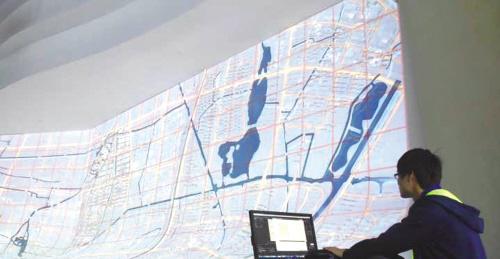 10月31日,秀洲光伏科技馆内,工作人员在为展示沙盘做视频调试。目前,秀洲光伏小镇客厅主建筑物已结顶,进入室内精装修阶段。