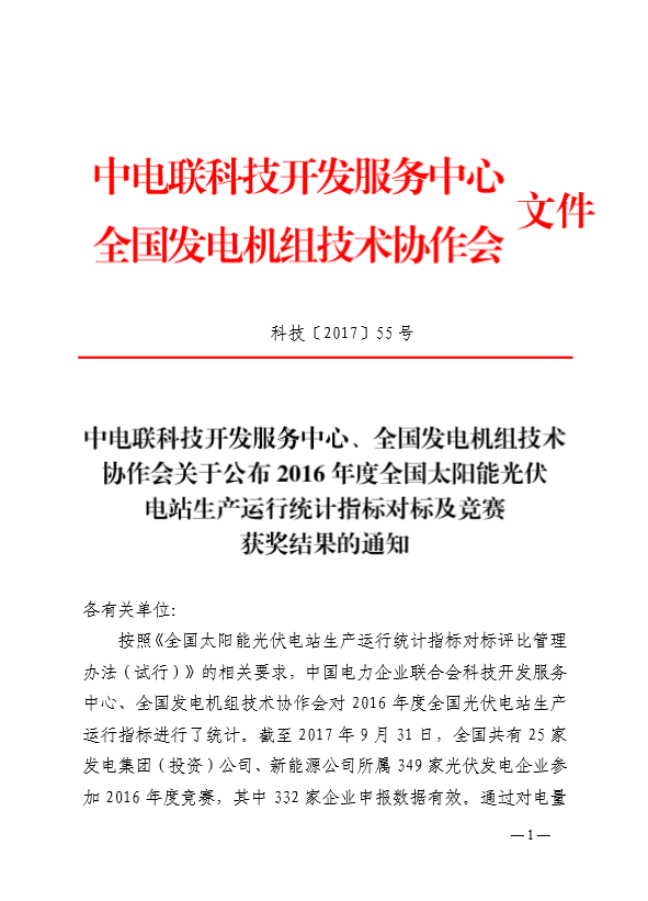 近日,中电联科技开发服务中心、全国发电机组技术协作会公布了《2016 年度全国太阳能光伏电站生产运行指标对标及竞赛获奖结果的通知》(以下简称“通知”)。