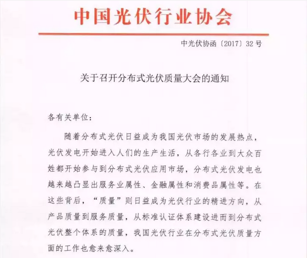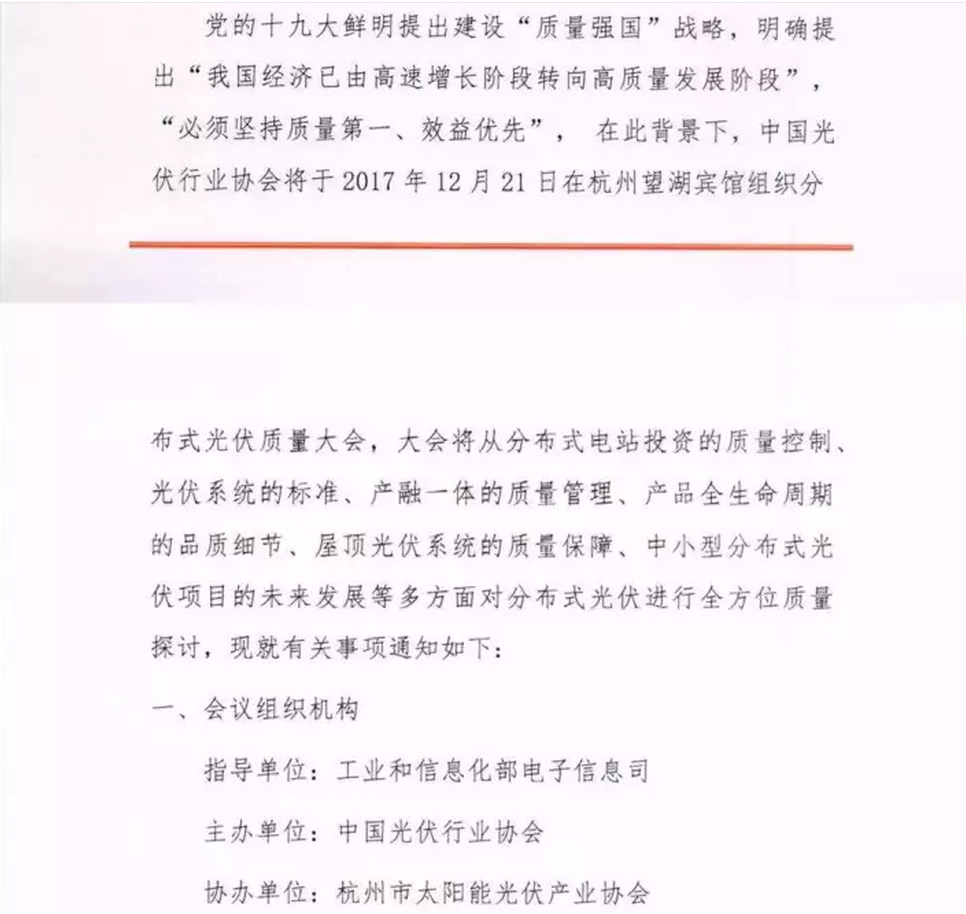 党的十九大鲜明提出建设“质量强国”战略,明确提出“我国经济已由高速增长阶段转向高质量发展阶段”,“必须坚持质量第一、效益优先”, 在此背景下,中国光伏行业协会及光伏們将于2017年12月21日在杭州望湖宾馆组织分布式光伏质量大会,大会将从分布式电站投资的质量控制、光伏系统的标准、产融一体的质量管理、产品全生命周期的品质细节、屋顶光伏系统的质量保障、中小型分布式光伏项目的未来发展等多方面对分布式光伏进行全方位质量探讨。会议详情如下: