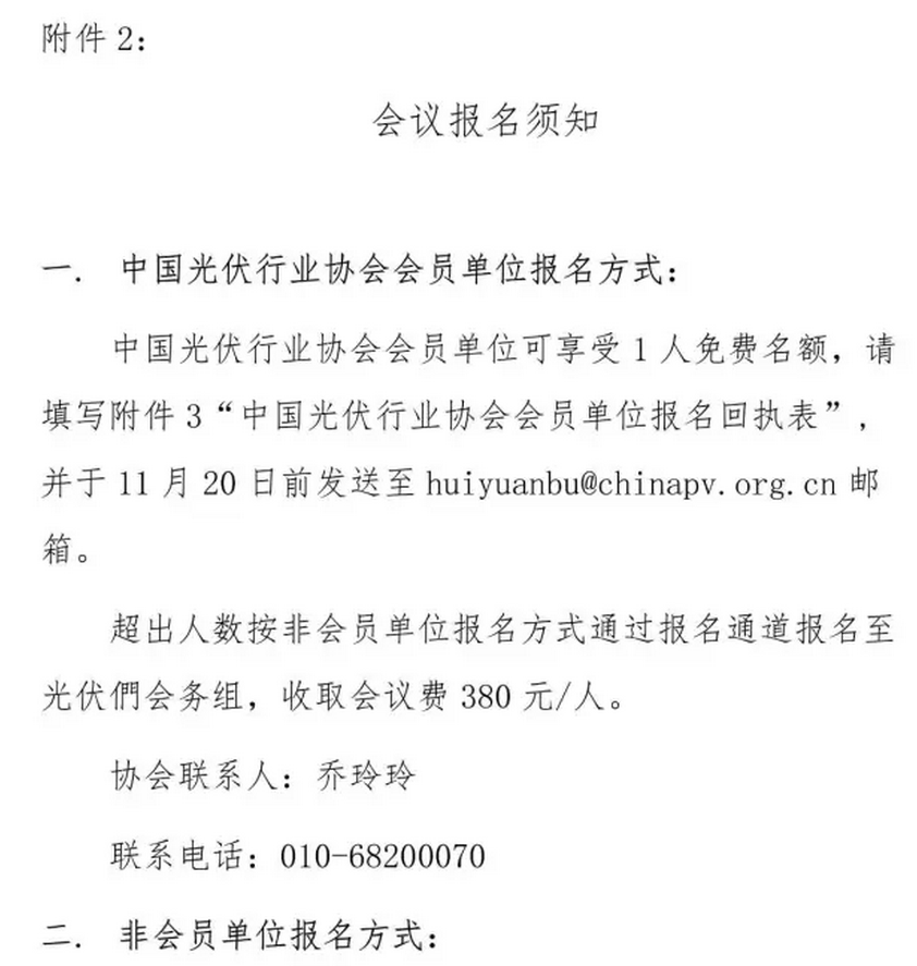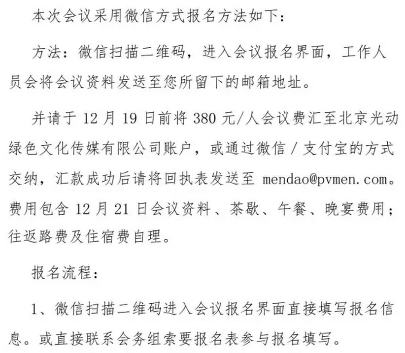 本次会议会务组织服务工作由光伏們承担,会议收取参会费用380元/人;中国光伏行业协会会员单位可享受1人免费名额,超出人数按380元/人缴纳;交通住宿自理。报名方式、缴费方法、联系方式等信息请参考附件2“会议报名须知”。