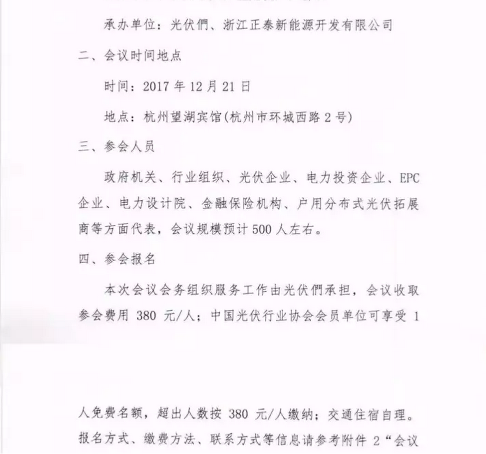 本次会议会务组织服务工作由光伏們承担,会议收取参会费用380元/人;中国光伏行业协会会员单位可享受1人免费名额,超出人数按380元/人缴纳;交通住宿自理。报名方式、缴费方法、联系方式等信息请参考附件2“会议报名须知”。