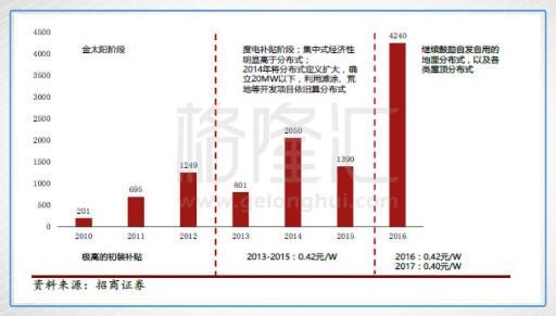 发改委2016年12月6日发文表明,2017年1月1日之后,一至三类资源分别调整为0.65元/0.75元/0.85元,同时表示今后光伏标杆电价根据成本变化情况每年调整一次。从2015年到2017年光伏标杆电价共下调0.25元/0.2元/0.15元,导致了集中式光伏以0.65元每千瓦的价格对比0.6元以上的成本,利润变得很薄。而另一方面,分布式由于不占用土地,纯并网发电成本仅为0.55元左右,分布式实行0.42元/kWh的度电补贴政策,这个标准自2013年确定,迄今未做调整,加上各地还有地方补贴,分布式光伏的补贴力度比起集中式有着天渊之别。随着陆上风电、集中式光伏补贴水平不断下调,分布式光伏补贴下调或许未来会到来,而这样的预期,将会直接刺激分布式光伏的抢装热潮。