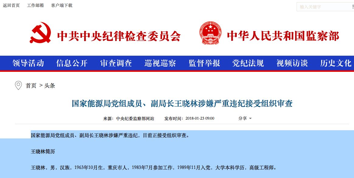 据中央纪委官网显示,国家能源局党组成员、副局长王晓林涉嫌严重违纪,目前正接受组织审查。