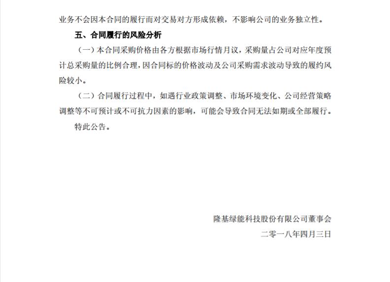 此外,公告显示,该合同预估总净额占隆基股份2017年度审计营业成本的约45%。有利于保障隆基股份多晶硅原材料的稳定供应,不会对隆基股份业绩造成直接影响。