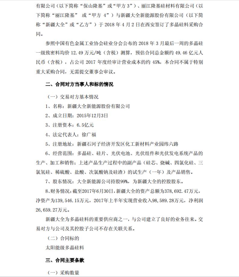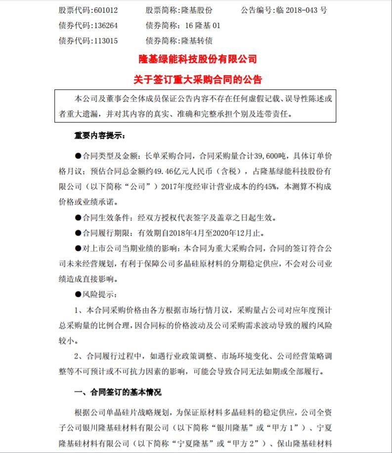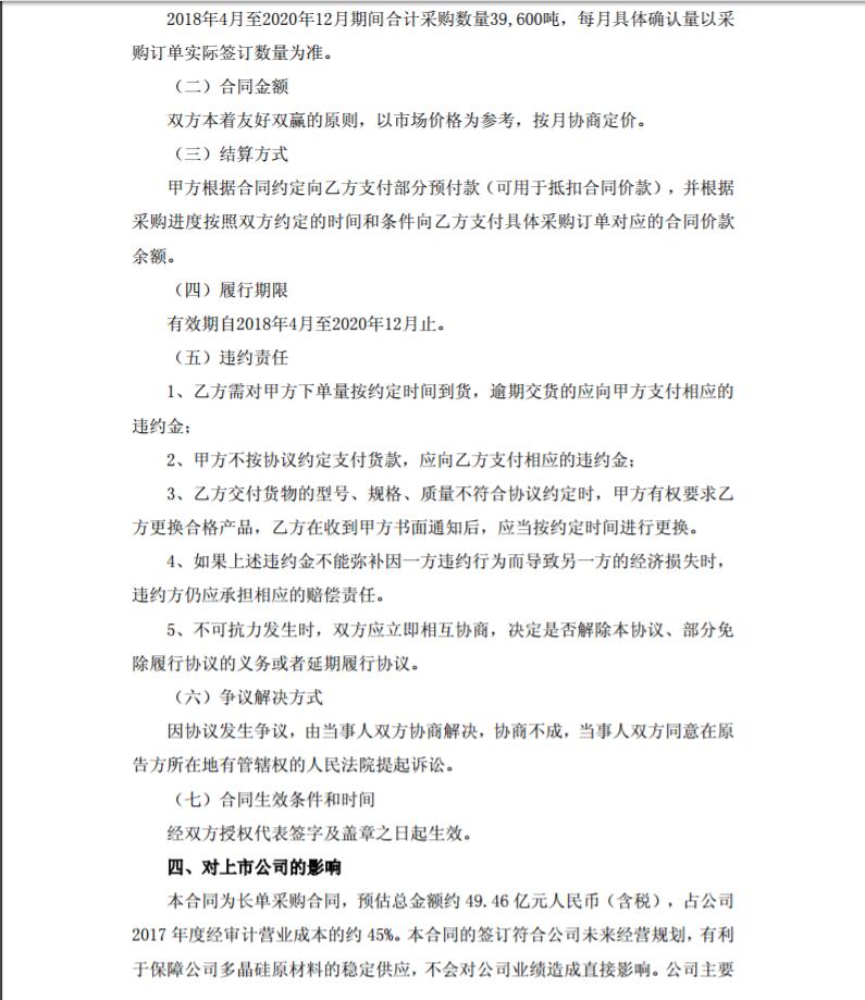 公告显示,该采购价格是根据中国有色金属工业协会硅业分会公布的2018年3月最后一周的多晶硅一级致密均价12.49万元/吨(含税)预测的,具体订单价格月议。合同履行期限是2018年4月到2020年12月。