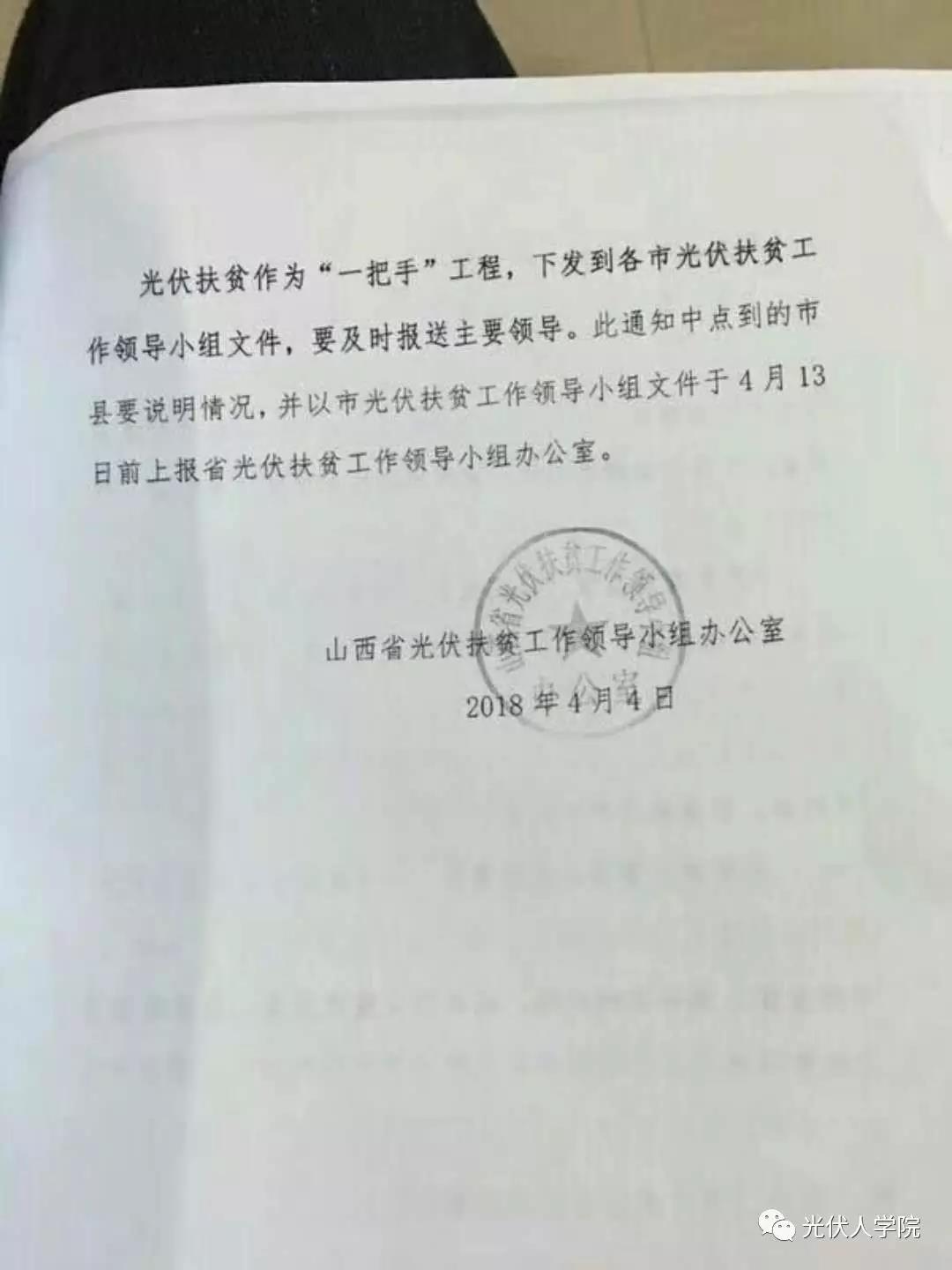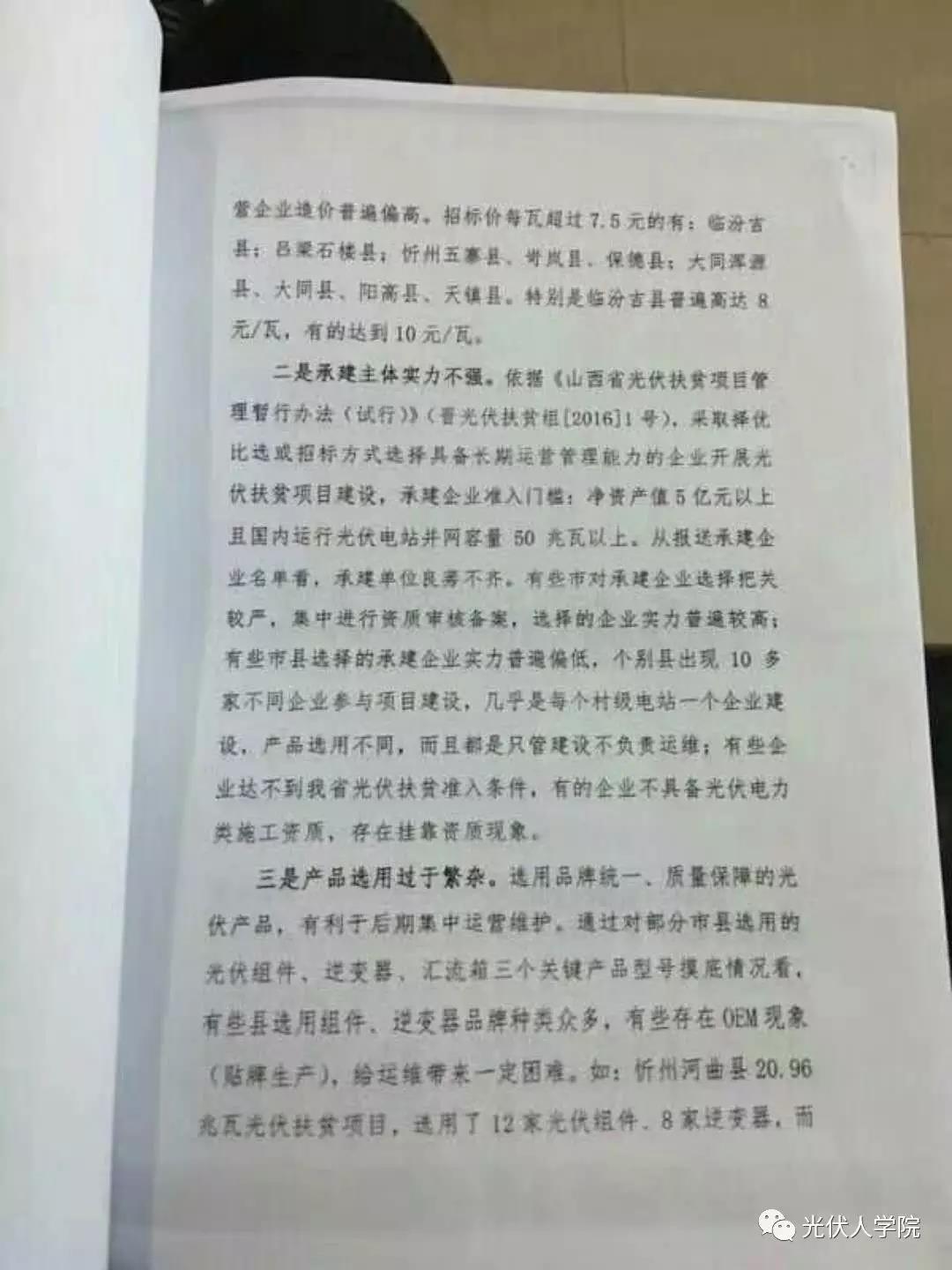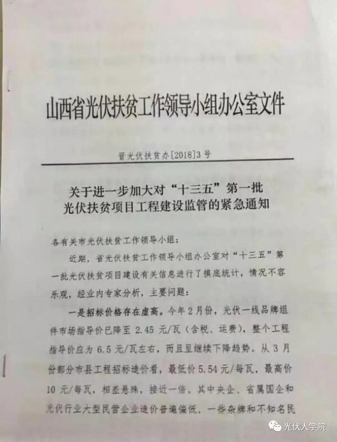 4月4日,山西省光伏扶贫工作领导小组办公室下发晋光伏扶贫办〔2018〕3号 《关于进一步加大对“十三五”第一批光伏扶贫项目工程监管的紧急通知》,指出山西省“十三五”第一批光伏扶贫项目存在招标价格虚高、承建主体实力不强、产品选用过于繁杂三方面的问题。
