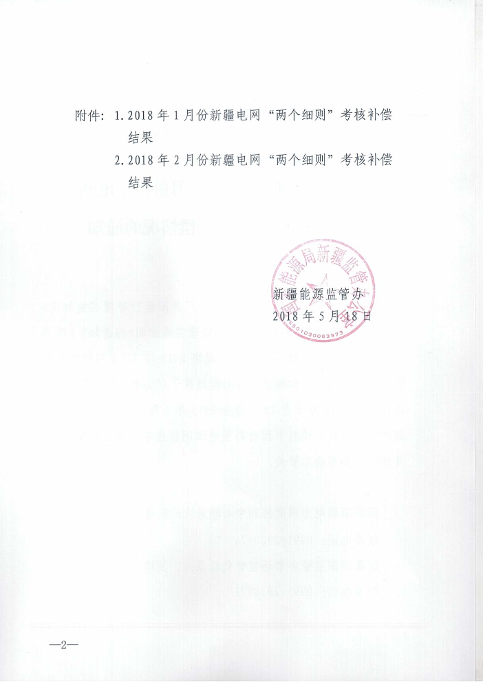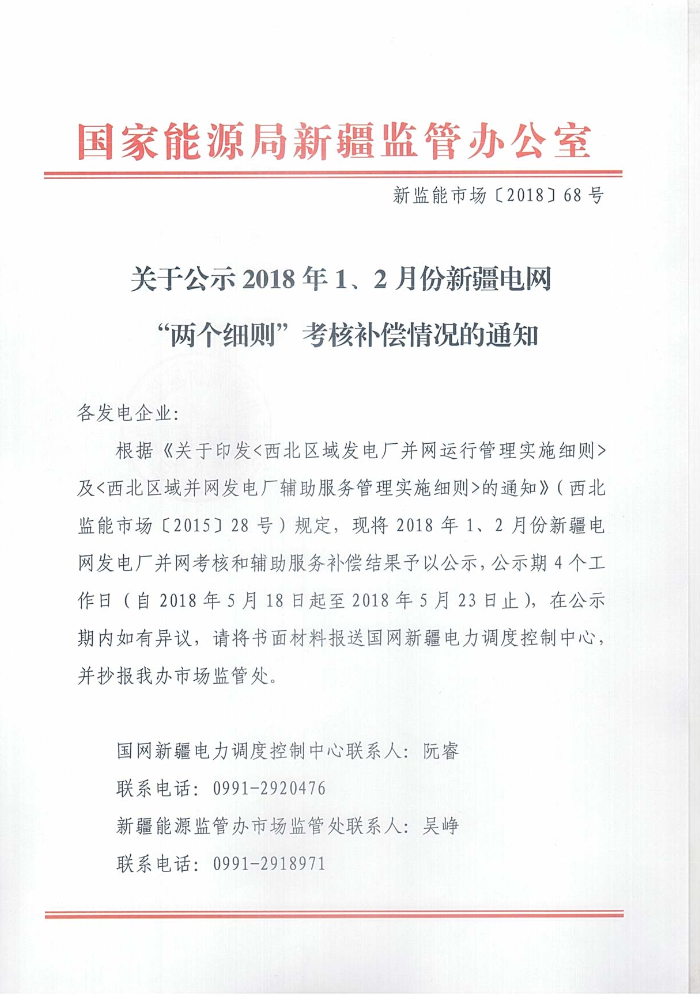 国家能源局新疆监管办公室关于公示2018年1、2月份新疆电网“两个细则”考核补偿情况的通知。