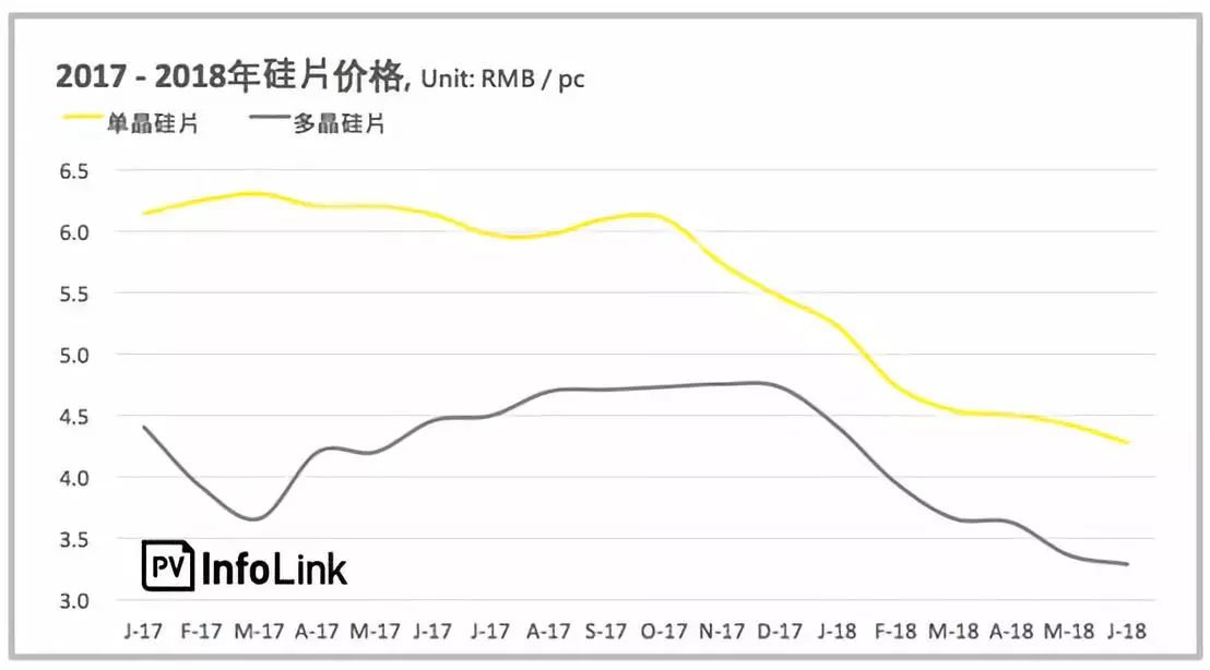 从上面三张图可以看出,硅料的价格较为不稳定,但硅片的价格在过去半年呈下降趋势。因为硅片是按每片价格计算的,所以随着电池技术的提升,最终反映到组件价格上下降趋势更明显。所以从2016-2018组件价格走势图上,可以看到组件从2017年底到近期的下降趋势并没有单晶硅片那么明显,但仍比多晶硅片降价幅度大。组件价格近期不是直线下降,一部分原因是受17年1231和18年630仍存在的小规模抢装影响。