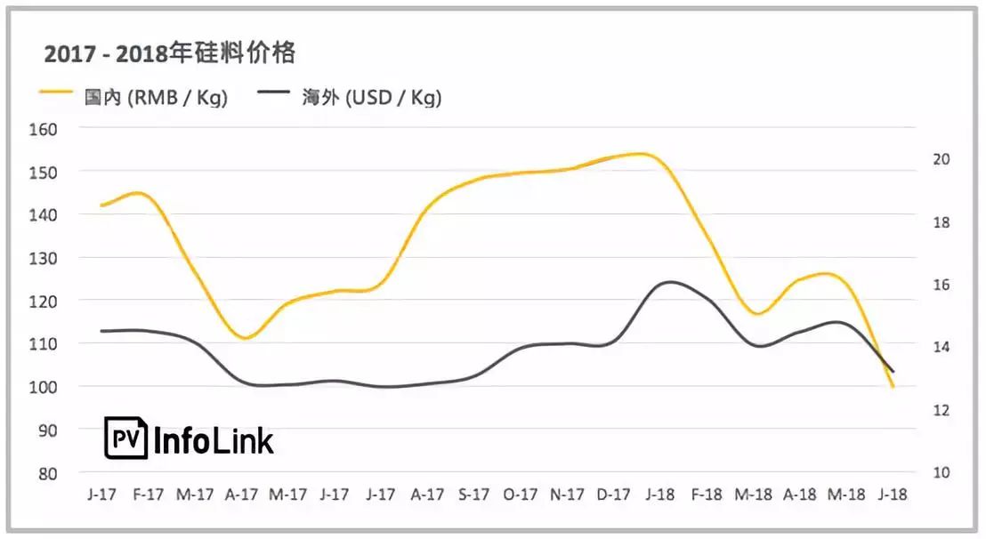 因为电价调整导致的630或1230抢装,每到电价调整时间点前,组件价格总会出现不降反涨的情况;但从表3全年的最低价看,组件价格平均每个月都有0.05元/瓦的降幅。此外,多位业内人士向光伏們表示,预计2018年第三季度,普通多晶组件价格有望下降至2.2元/瓦,“未来的组件价格下降将主要依赖于硅材料价格的下调。”
