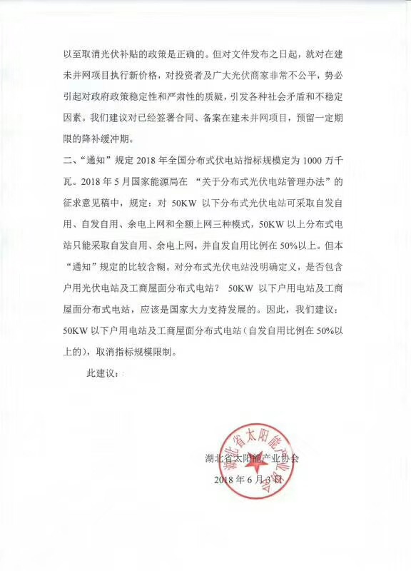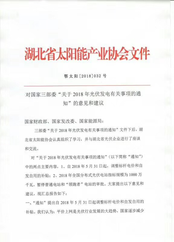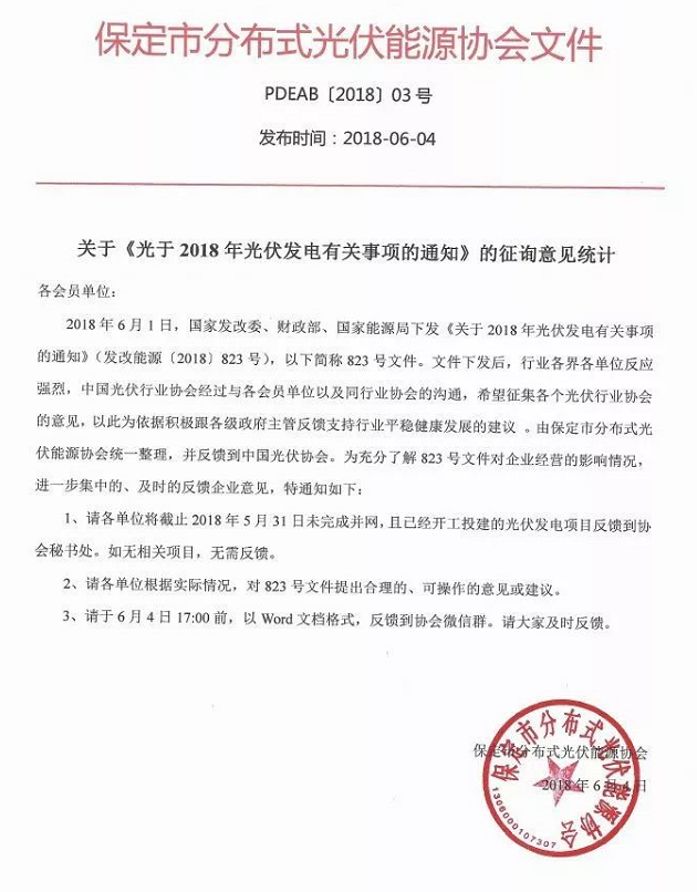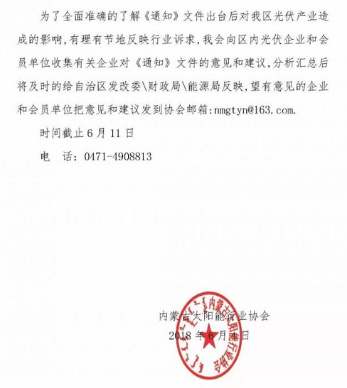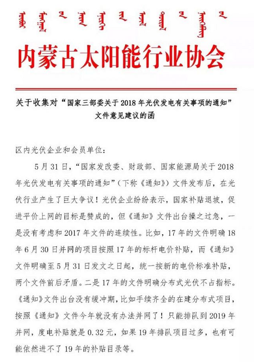 6月1日,国家发展改革委、财政部、国家能源局联合印发了《关于2018年光伏发电有关事项的通知》,引爆了光伏行业。许多行业人士认为文件出台操之过急,某些规定不合理,为此内蒙古太阳能行业协会、保定市分布式光伏能源协会、湖北省太阳能产业协会纷纷印发了征求意见文件。