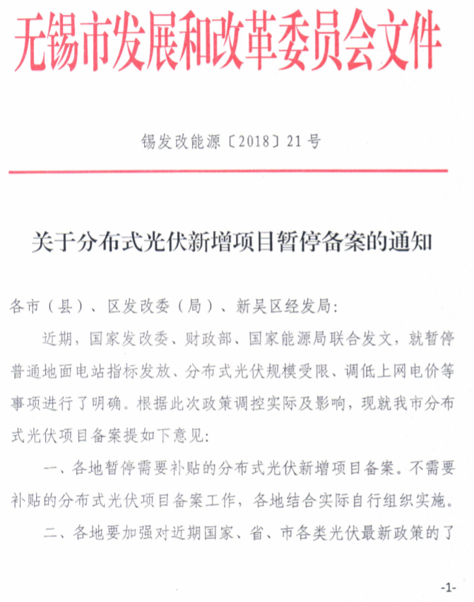 6月6日,江苏无锡市发改委印发《关于分布式光伏新增项目暂停备案的通知》。原文如下: