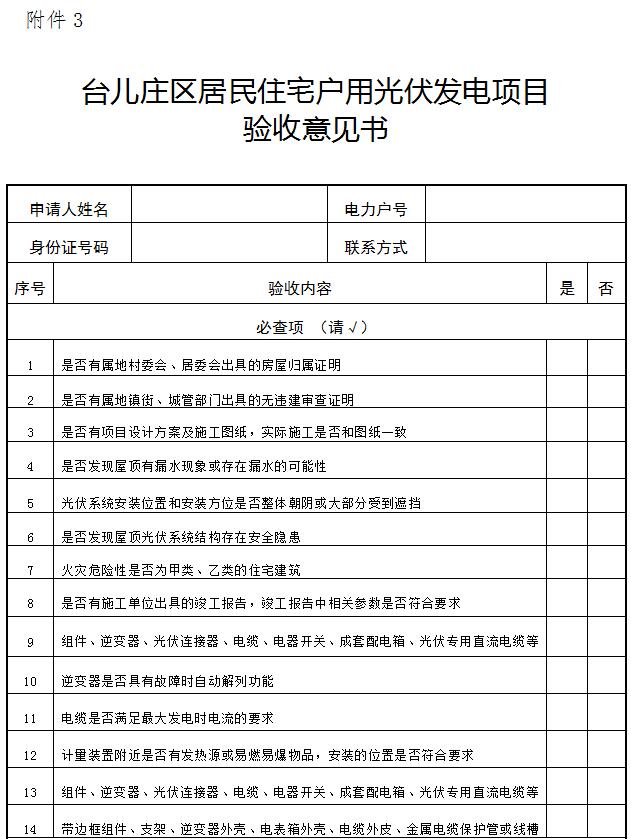 3、台儿庄区居民住宅户用光伏发电项目验收意见书