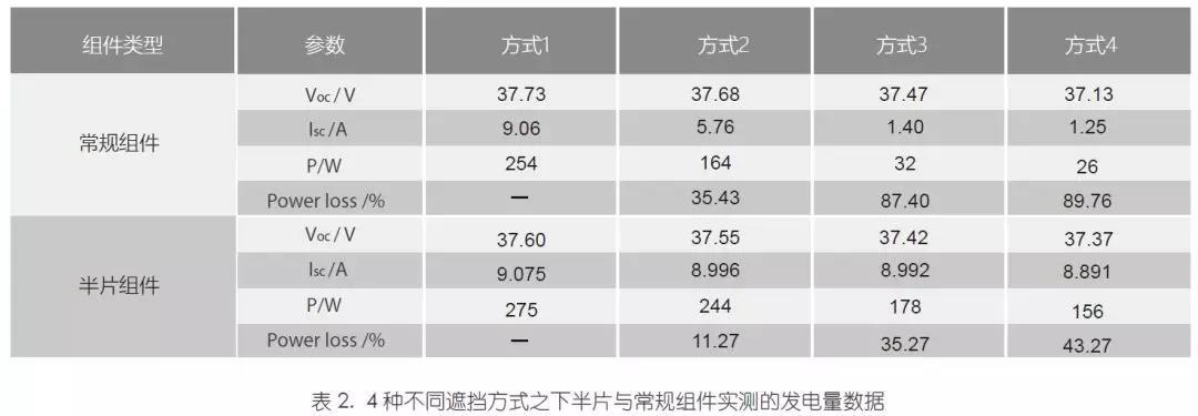 正如上文提到,半片电池片为标准电池片对半均割后得到的。因此,其内部的电流减少一半。随着电流的减少,电池内部的功率损耗降低。而功率损耗通常与电流的平方成比例,因此整个组件的功率损耗减小为四分之一(Ploss = R I2,其中R 是电阻,I 是电流)降低半片电池片功率损耗,可使其具有更大的填充因数、更高的转化效率,也就能获得更大发电量,尤其是在高辐射的环境中。组件具有较大的填充因数,意味着其内部串联电阻较小,其内部的电流损耗也较小(表1)。
