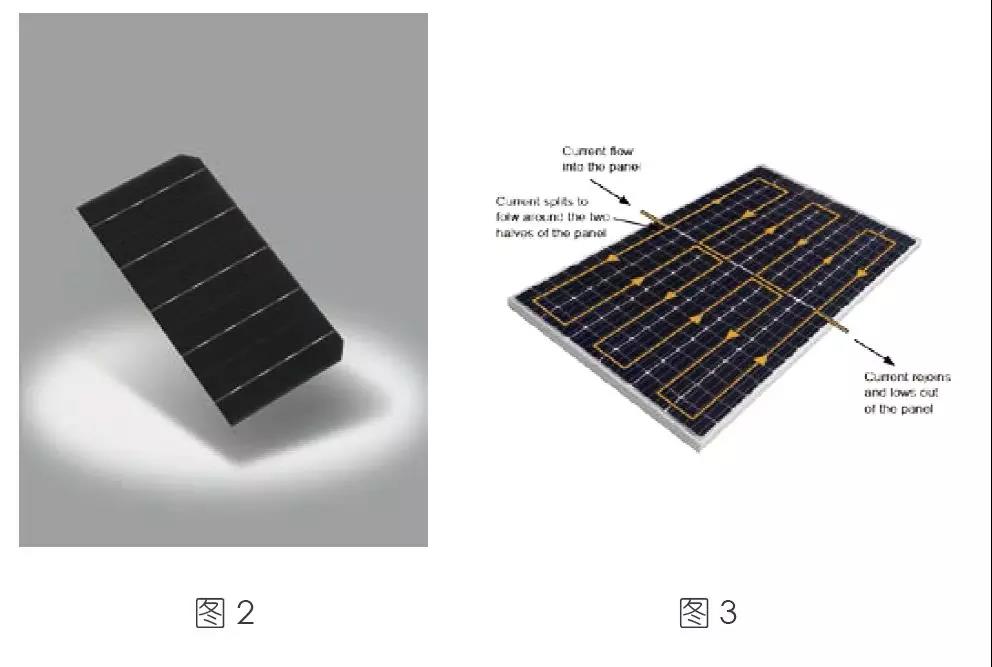 整个组件的电池片随之被分为两组,每组包含串联连接的60个半片电池片。组成一个完整的120片组件,从而可将通过每根主栅的电流降低为原来的1/2,内部损耗降低为整片电池的1/4,进而提升组件功率。