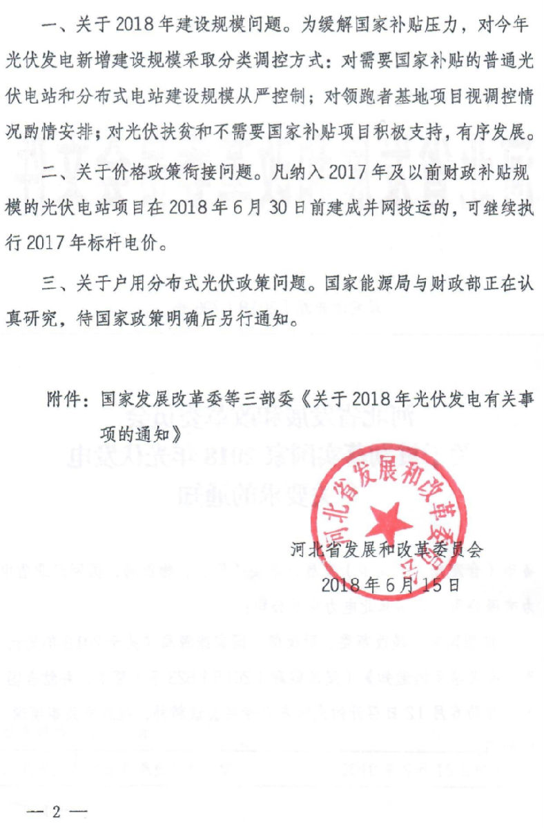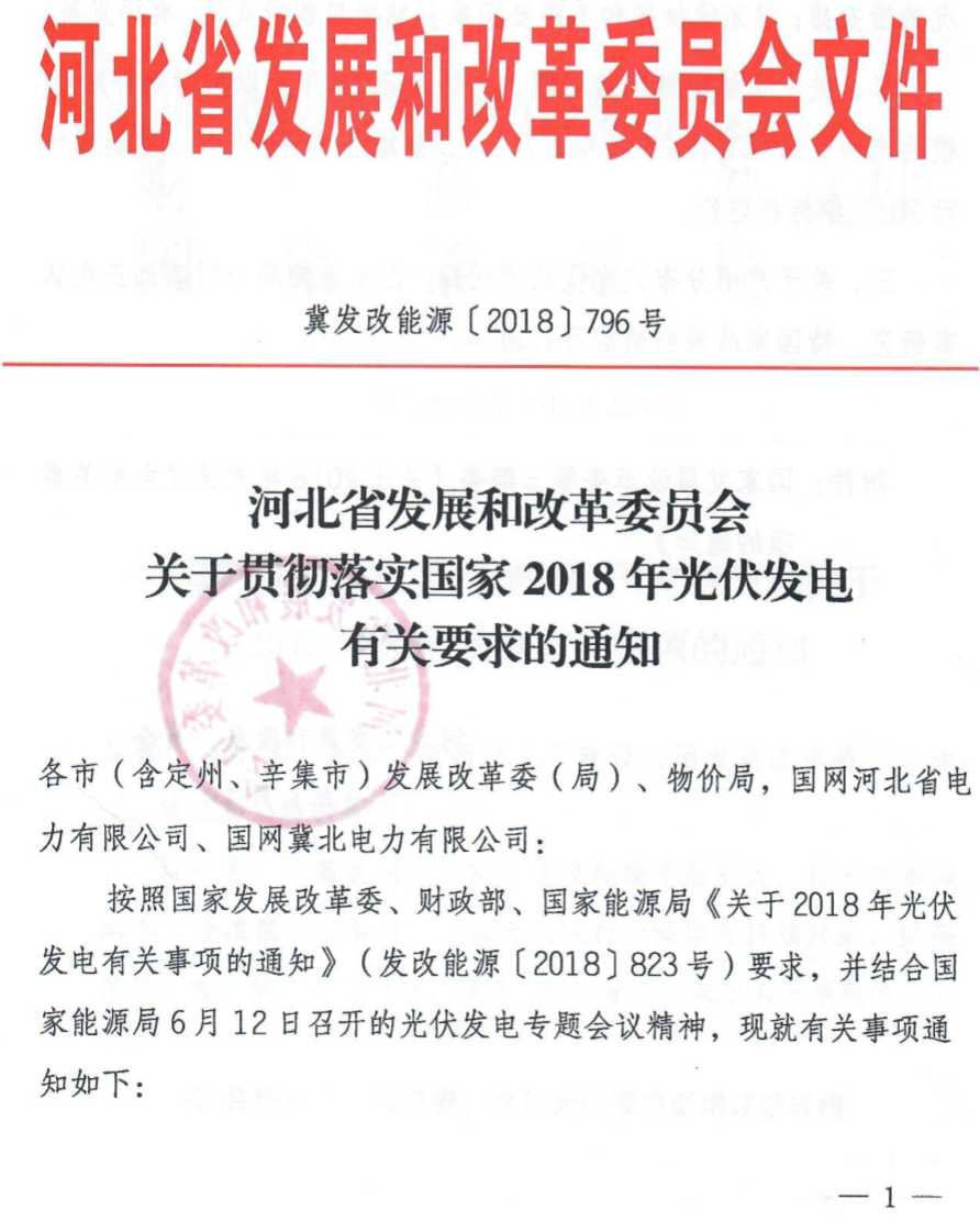 6月15日,河北省发改委下发《关于贯彻落实国家2018年光伏发电有关要求的通知》。要点如下: