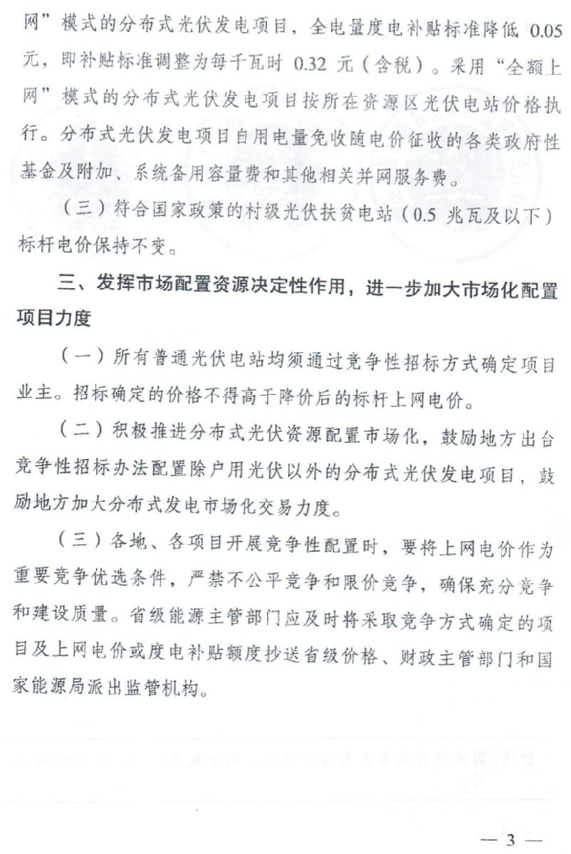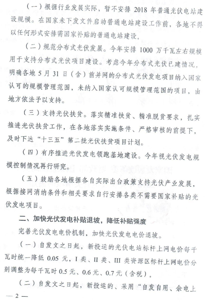 二、今年,从严控制需要国家补贴的普通光伏电站和分布式电站建设规模;对领跑者基地项目视调控情况酌情安排;对光伏扶贫和不需要国家补贴项目积极支持。