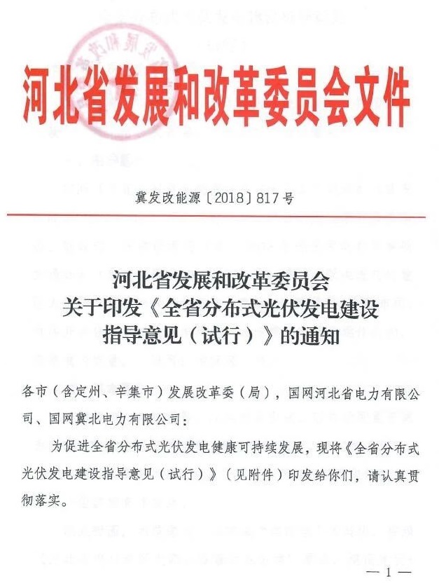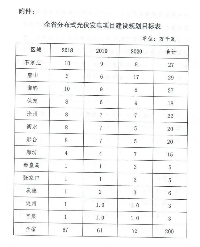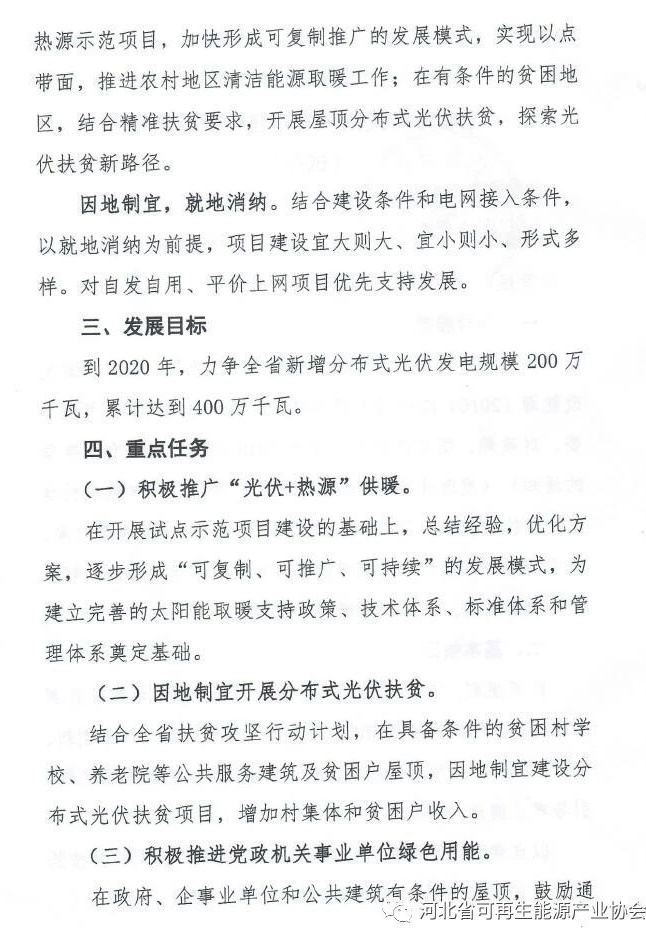 到2020年,河北省新增分布式光伏发电规模200万千瓦,累计达到400万千瓦。今年,河北省分布式光伏发电项目建设规划目标为67万千瓦。原文如下: