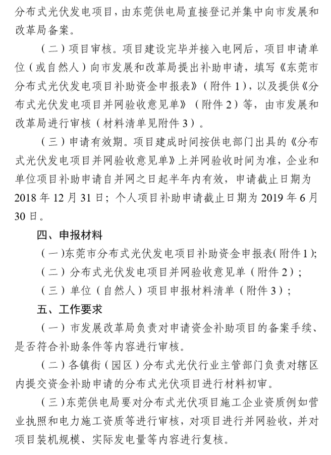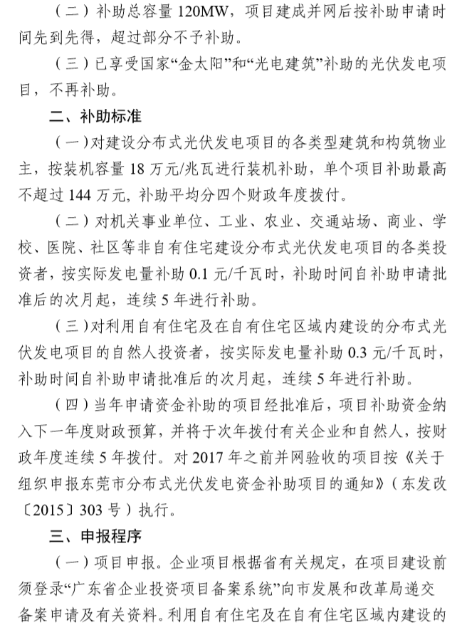 2017-2018年东莞市分布式光伏专项资金补助项目总容量为120MW,项目建成并网后按补助申请时间先到先得。截至2018年6月30日,已并网发电并提交补贴申请的分布式光伏项目容量约为108MW,余下的补助项目容量约为12MW!
