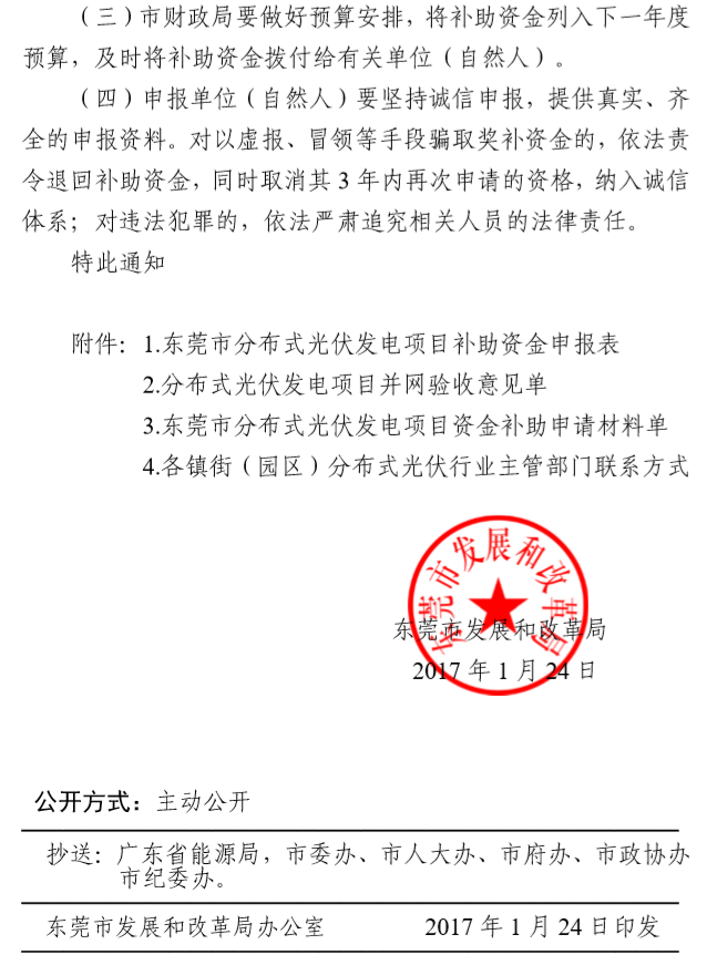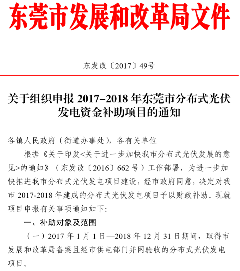 近日,广东省东莞市发展和改革局印发关于我市2017-2018年分布式光伏专项资金补助项目容量情况的通知,指出对分布式光伏发电项目的各类型建筑和构筑物业主,按装机容量18万元/MW补助,单个项目补助不超144万元,分4年拨付。
