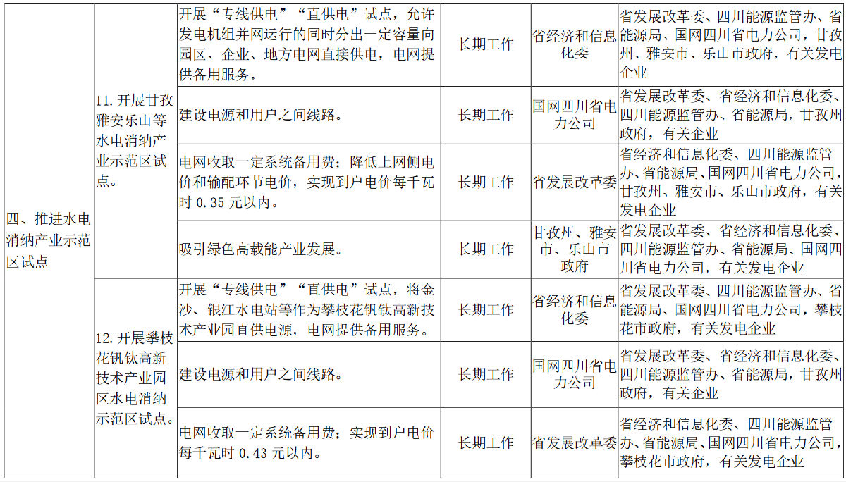 12.开展攀枝花钒钛高新技术产业园区水电消纳示范区试 点。利用攀西断面弃水电量降低攀枝花钒钛产业电价,以“专线 供电”方式将金沙、银江水电站等作为攀枝花钒钛高新技术产业 园区直供电源,实现到户电价每千瓦时0.43元以内。