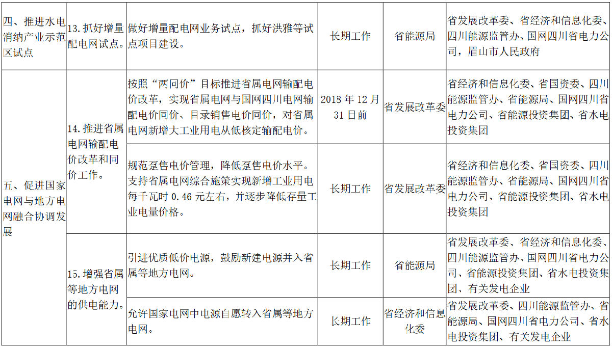 14.推进省属电网输配电价改革和同价工作。按照“两同价”目标推进省属电网输配电价改革,实现省属电网与国网四川电网输配电价同价、目录销售电价同价,对省属电网新增大工业用电从低核定输配电价。规范趸售电价管理,降低趸售电价水平。支持省属电网综合施策实现新增工业用电每千瓦时0.46元左右,并逐步降低存量工业电量价格。