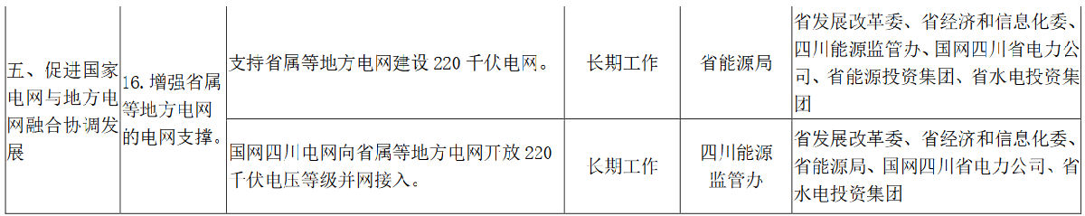 16.增强省属等地方电网的电网支撑。支持省属等地方电网 建设220千伏电网,国网四川电网向省属等地方电网开放220千伏电压等级并网接入。允许省属等地方电网因地制宜与周边省份电网开展网际间合作。