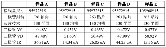 为了尽量消除接线盒中其他因素对测量结果的干扰,我们统一选体积相似的接线盒,130mil芯片二极管,同一封装厂制造的二极管,做成5个灌胶接线盒(A/B/C/D/E)对比样品。