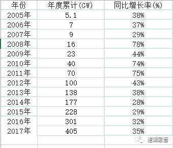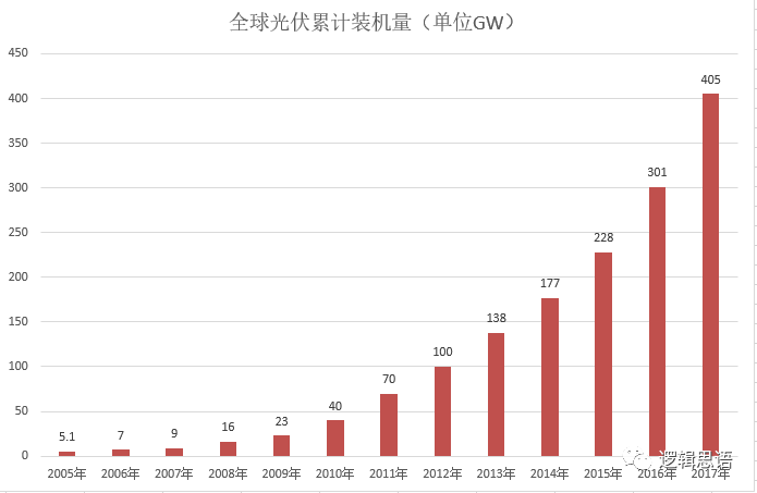 我们来看一组数据,这是全球光伏装机容量从2005年到2017年的累计装机量统计。