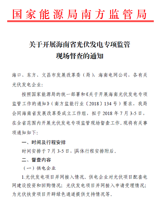 6月26日,国家能源局南方监管局发布《关于开展海南省光伏发电专项监管现场督查的通知》。