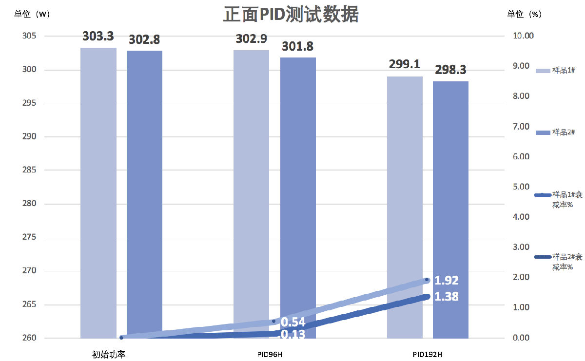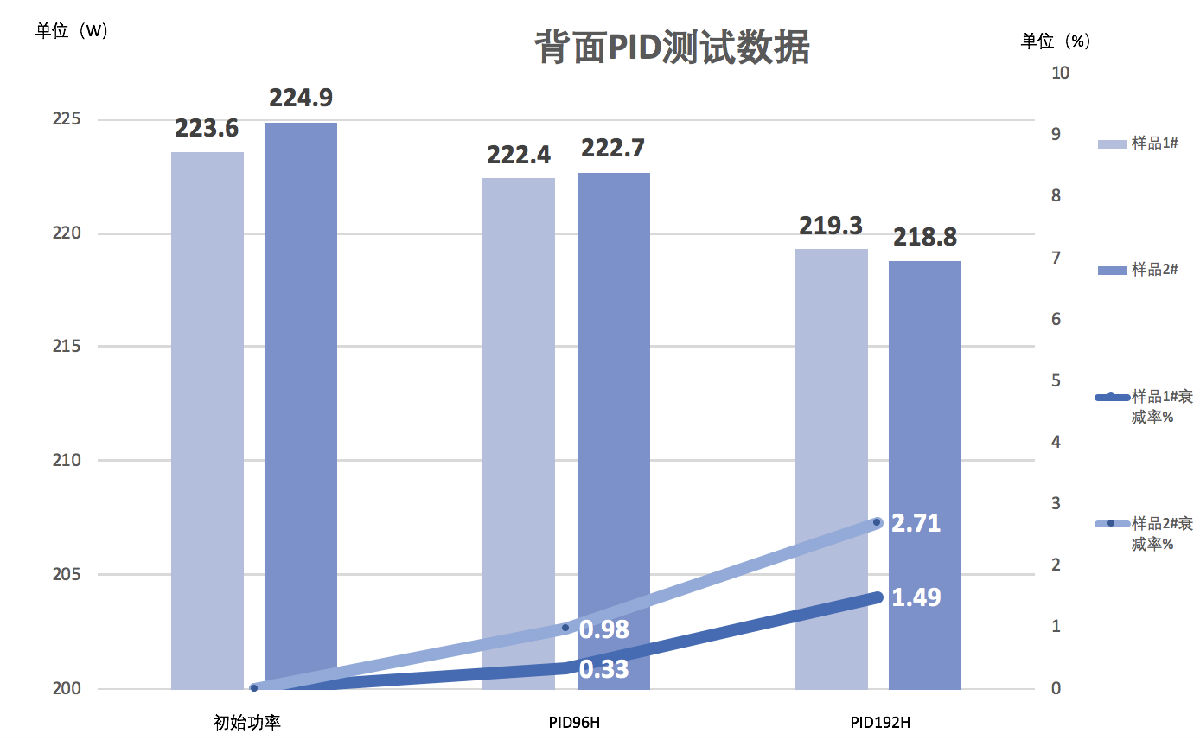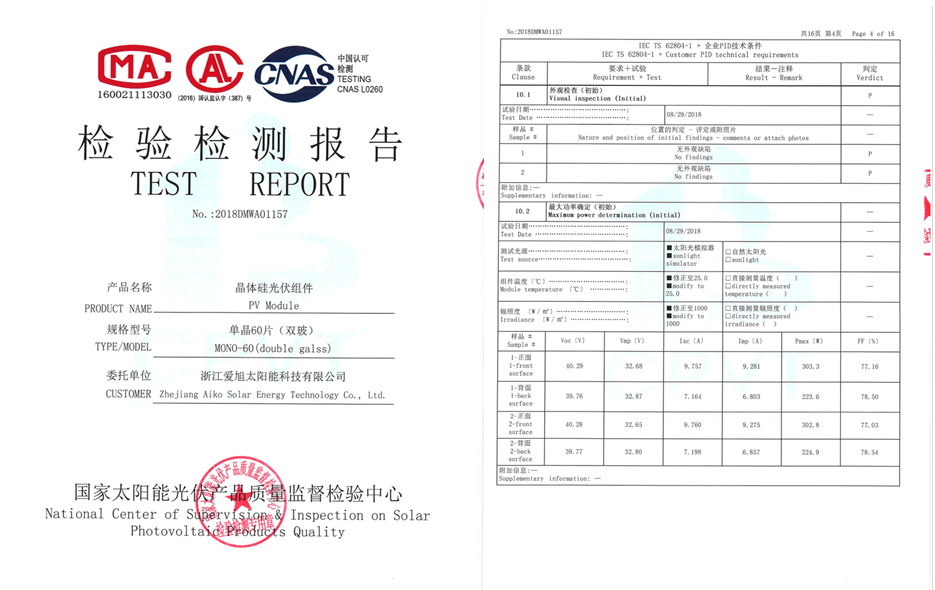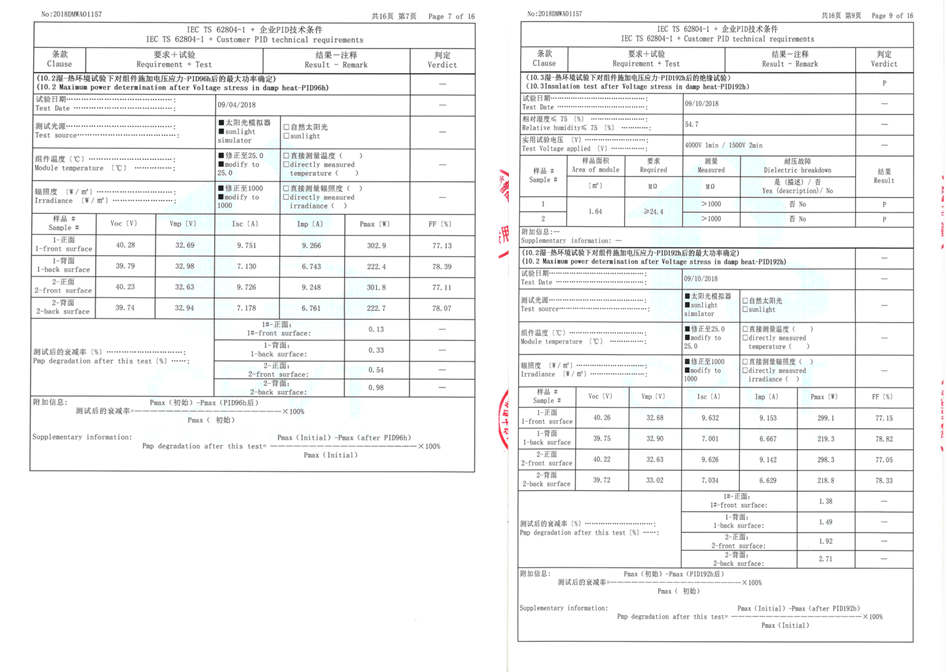 本次颁发证书的检测机构为国家太阳能光伏产品质量监督检测中心(CPVT)发放,检测标准为温度85℃,湿度85%,电压-1500V,测试时间为192小时(两倍IEC标准)。测试完成后使用爱旭电池PID衰减值≤3%,测试结果优异。
