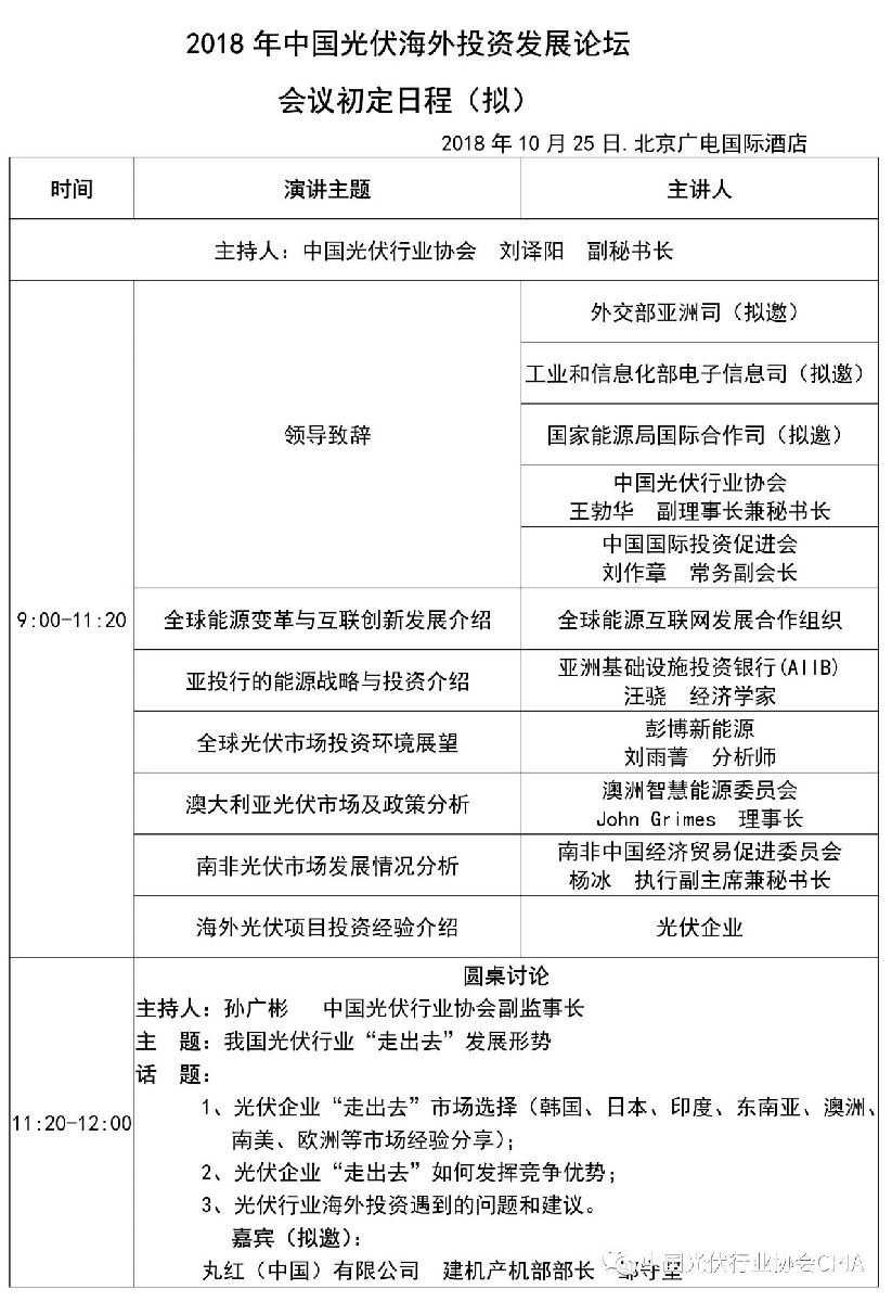在此背景下,为帮助企业了解海外投资环境,更好的协助企业开辟海外光伏市场。中国光伏行业协会拟于2018年10月25日在北京广电国际酒店举办2018年中国光伏海外投资发展论坛,邀请政府主管部门、研究机构、金融保险机构、海外电力投资企业、光伏企业的领导和专家,一起就海外光伏市场发展形势、政策环境、光伏发电项目开发及投融资情况等问题进行交流分析。