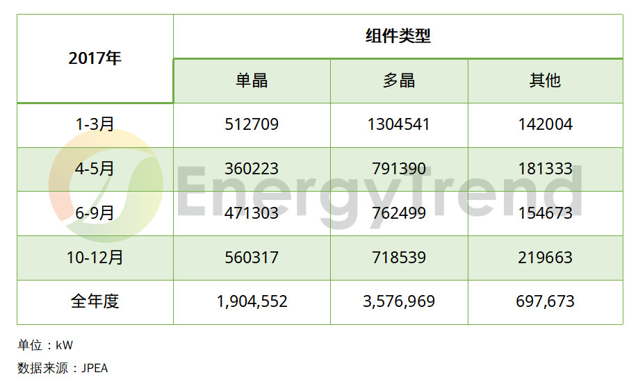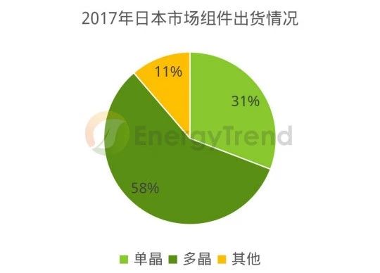 在2017年日本光伏组件出货量中,JPEA季度数据显示多晶组件出货量为3.58GW,占比总出货量的57.9%;单晶组件1.9GW,占比30.8%。