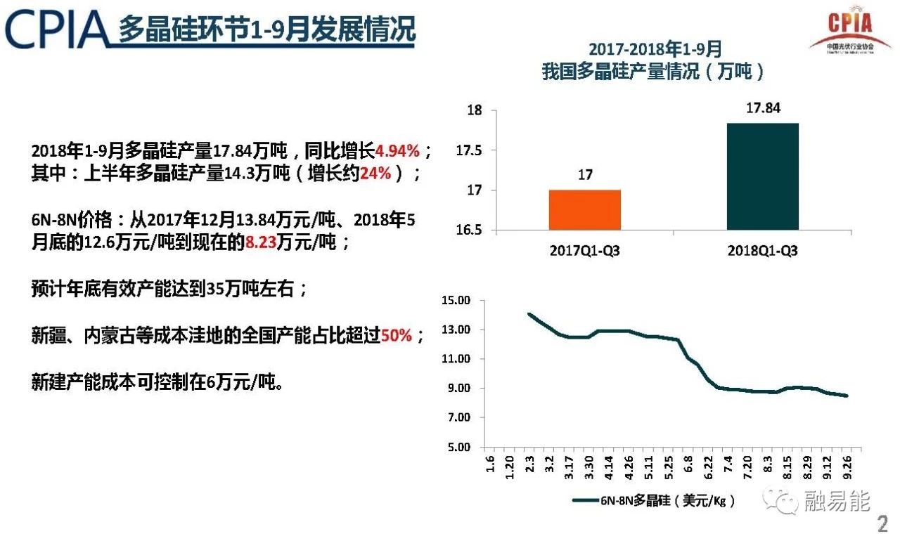 2018年1-9月多晶硅产量17.84万吨,同比增长4.94%;其中,上半年多晶硅产量14.3万吨,增长约24%;