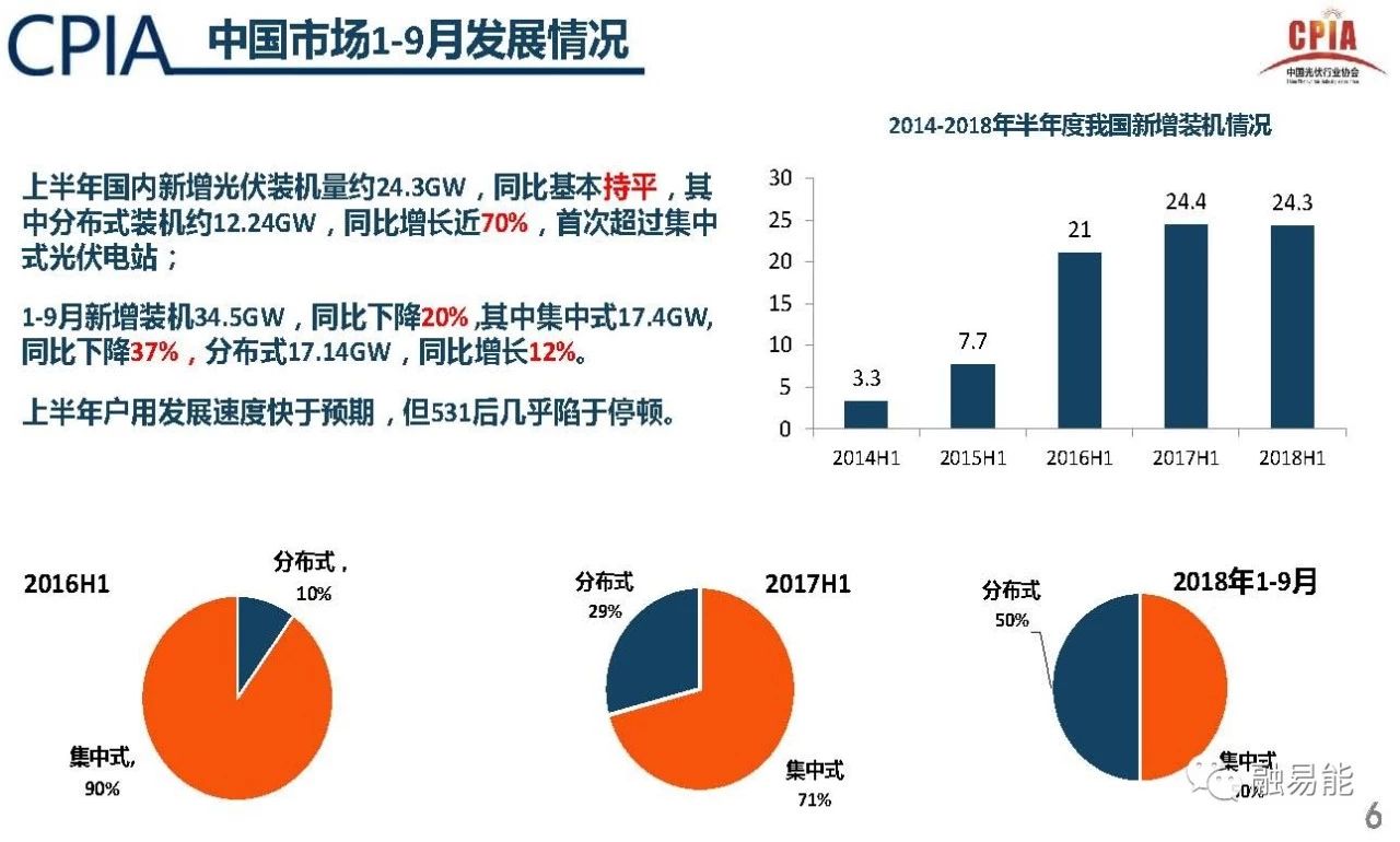 2018年1-9月,我国光伏新增装机34.5GW,同比下降20%,其中集中式17.4GW,同比下降37%,分布式17.14GW,同比增长12%。
