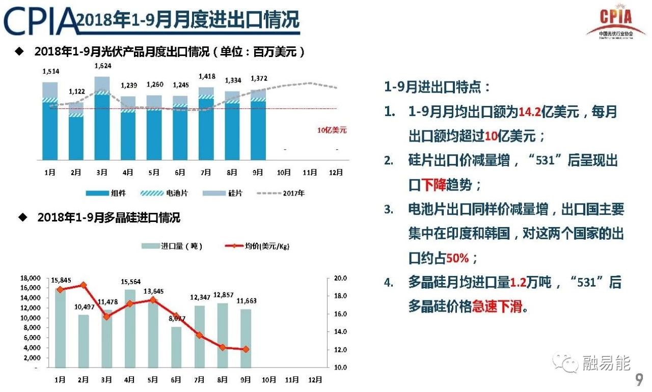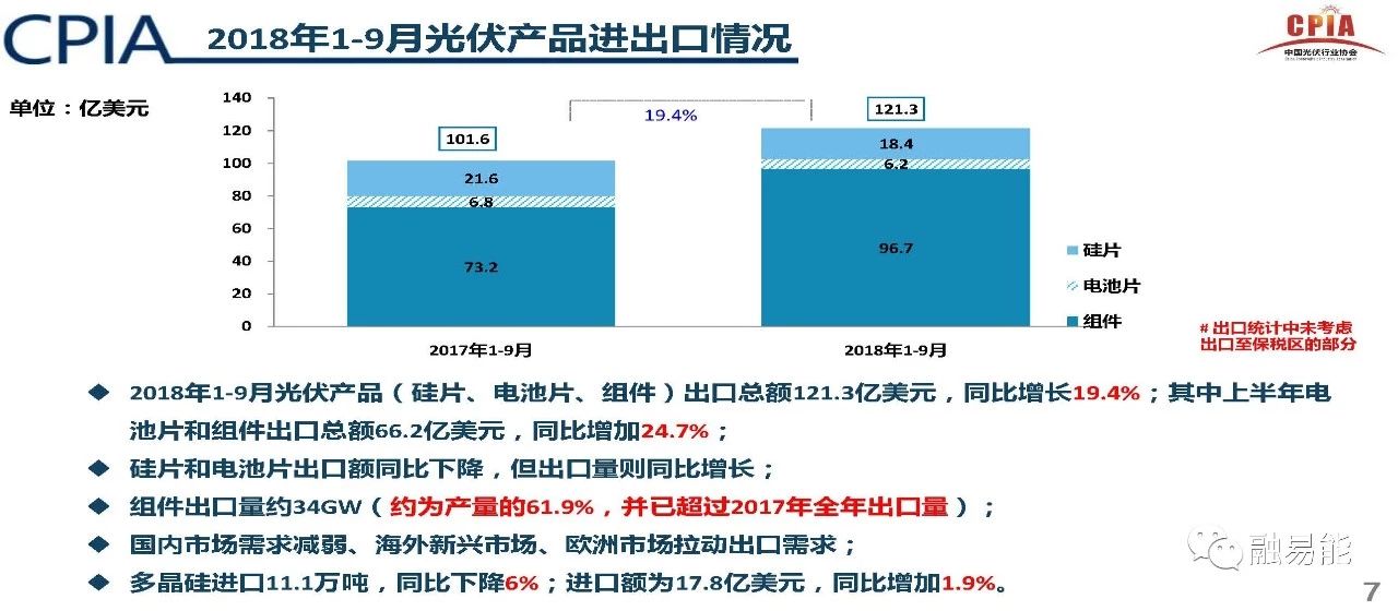 1-9月,光伏(含硅片、电池、组件)的出口总额121.3亿美元,同比增长19.4%。其中,上半年的电池片和组件出口额为66.2亿美元,同比增加24.7%;