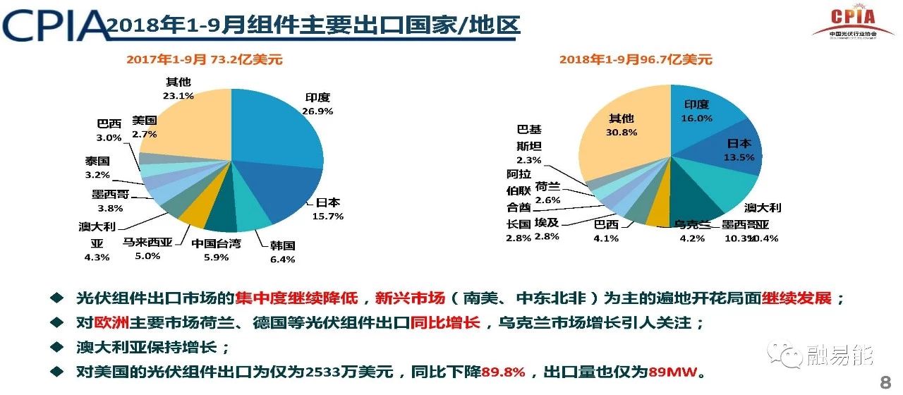 组件出口量为34GW,约为产量的61.9%,并已经超过2017年全年的出口量。组件出口市场的集中度继续降低,新兴市场(南美、中东北非)为主的遍地开花局面继续发展;对欧洲主要市场荷兰、德国等组件出口同比增长,乌克兰市场增长引人关注。对澳大利亚保持增长;对美国的组件出口仅为2533万美元,同比下降89.8%,出口量仅为89MW。