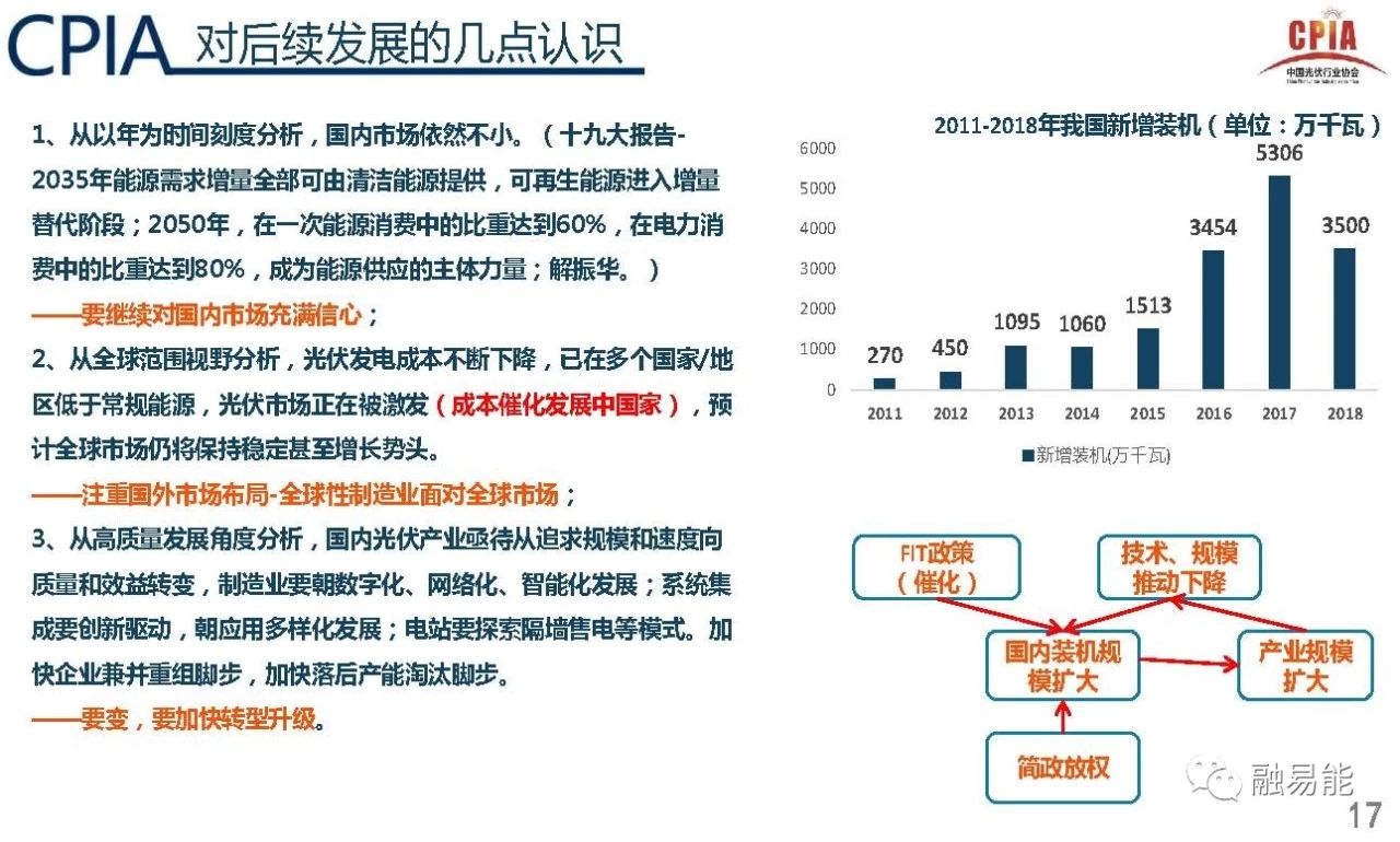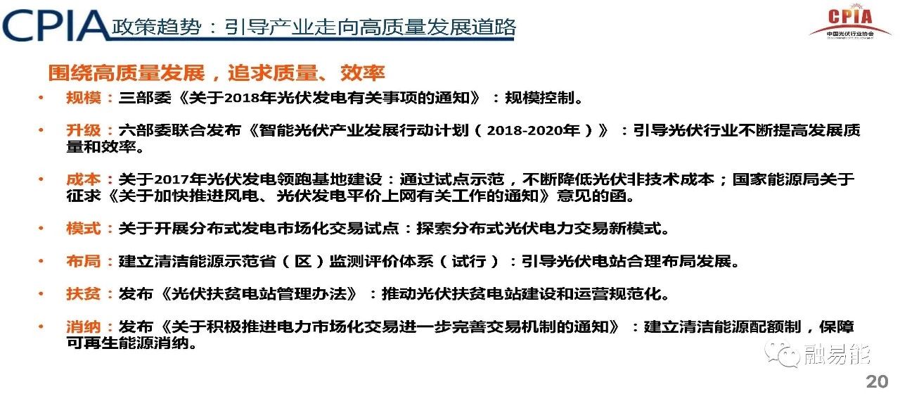 3、从高质量发展角度分析,国内光伏产业亟待从追求规模和速度向质量和效益转变,制造业要朝着数字化、网络化、智能化发展;系统集成要创新驱动,朝着应用多样化发展;电站要探索隔墙售电等模式。加快企业兼并重组脚步,加快落后产能淘汰。