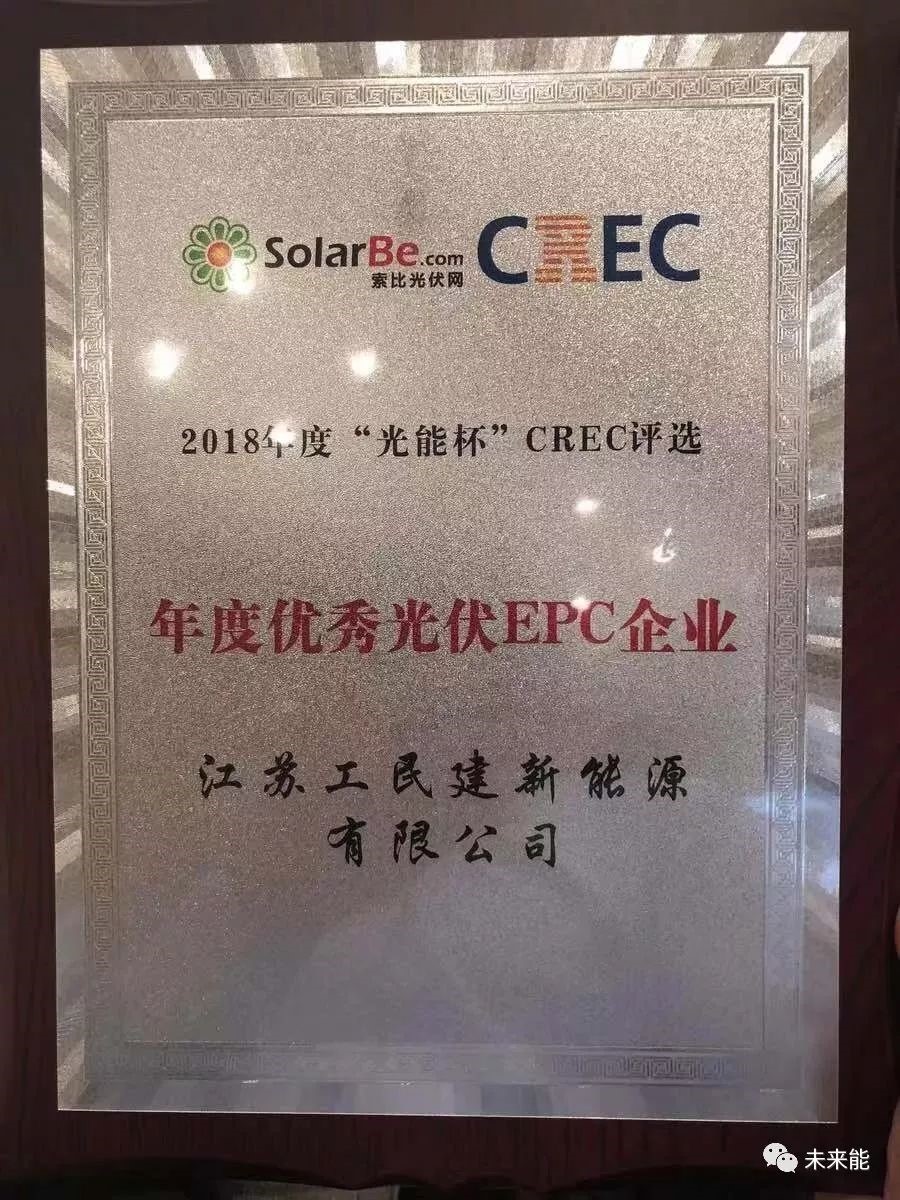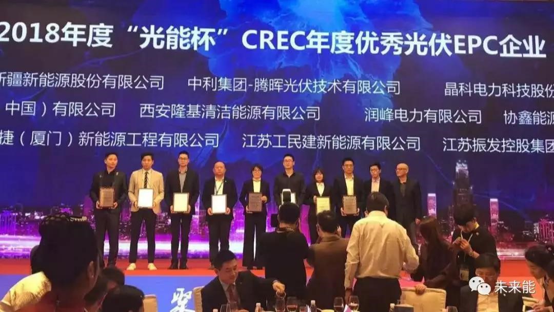 2018年10月31日,公司受邀参加“协鑫之夜”晚宴,并荣获“光能杯”CREC评选的“2018年度优秀光伏EPC企业奖”!手捧奖杯,未来能喜迎CREC|2018!