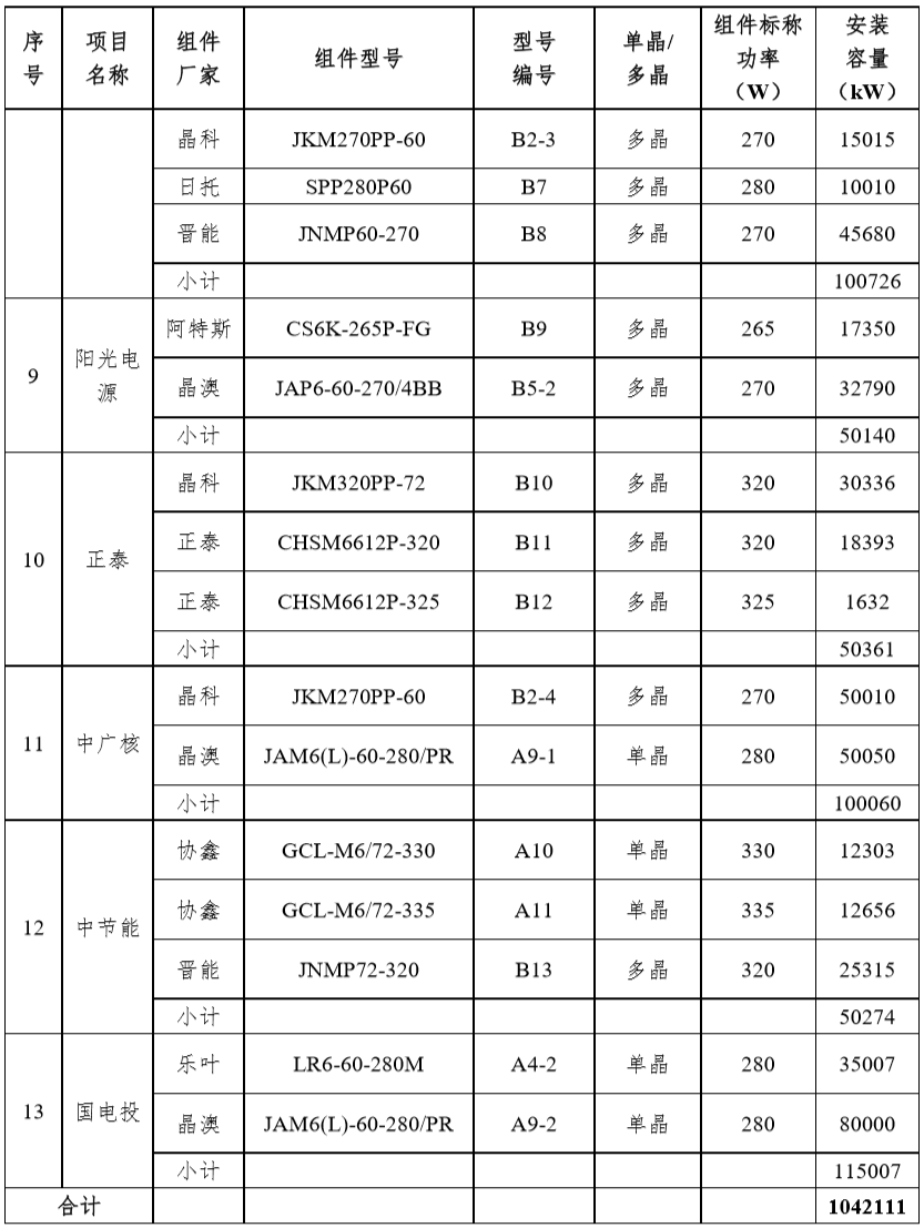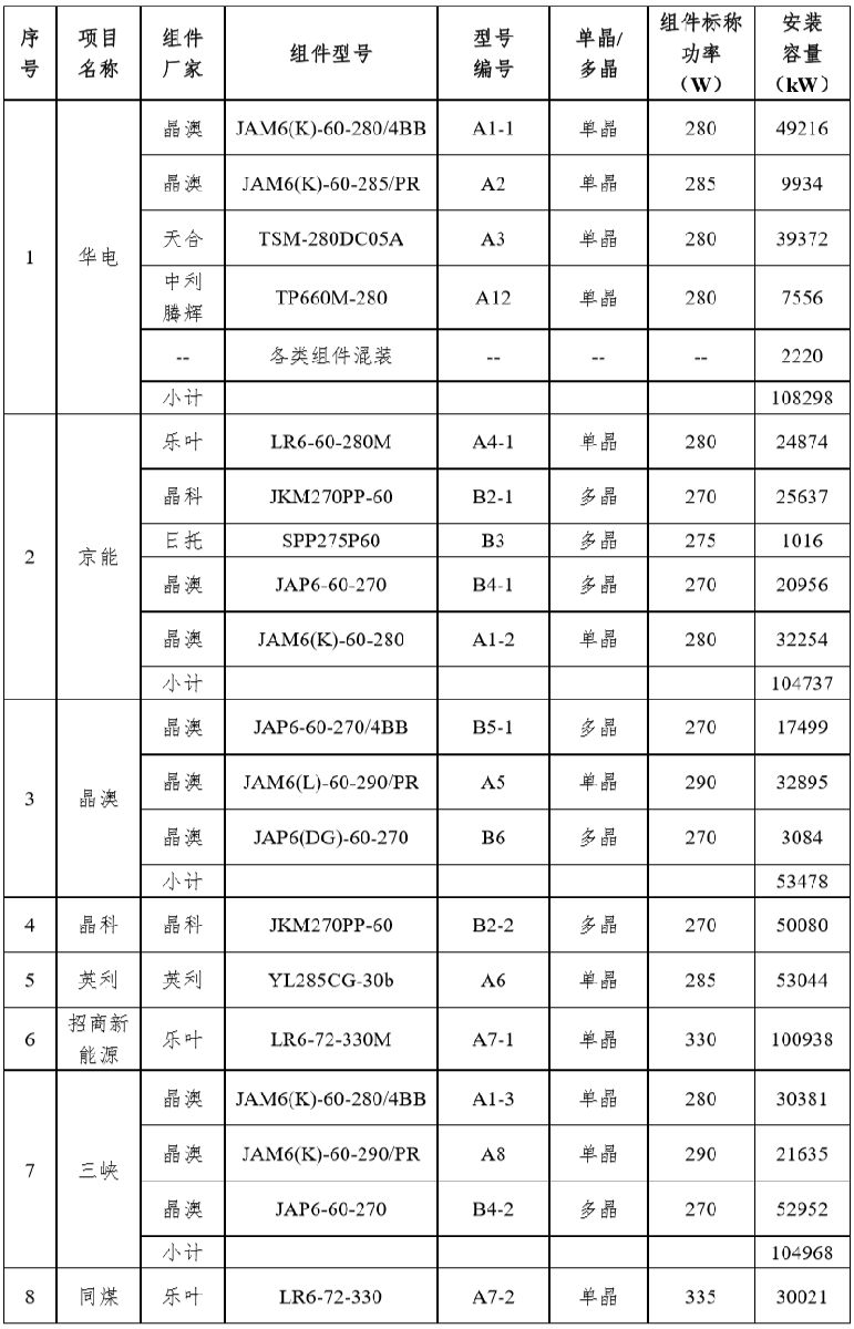 根据各项目业主提供的情况和项目实际安装容量,统计得到各项目安装容量和使用组件情况见表1和表2。