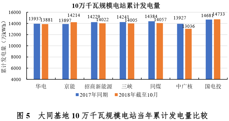 项目今年截至10月累计发电量为13036万千瓦时(中广核)~14733万千瓦时(国电投) 。与去年同期比较,京能(2.3%)和国电投(0.4%)累计发电量略有增长,其他各项目累计发电量同比均有减少,降幅最大的项目是中广核(-6.4%),同比减少最少的是华电(-0.4%)。