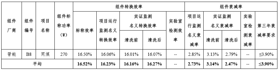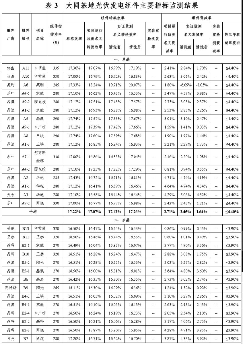 根据大同基地招标文件规定,基地所用光伏组件,多晶组件转换效率不低于16.5%,单晶组件转换效率不低于17.0%。衰减率应满足首年不超过2.5%(多晶)、3.0%(单晶),之后每年衰减率不高于0.7%。大同基地各项目并网运行进入第三年,单晶和多晶组件衰减率要求分别调整为4.4%和3.9%。