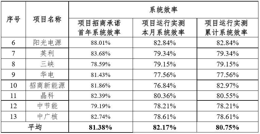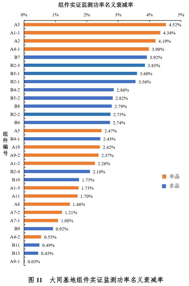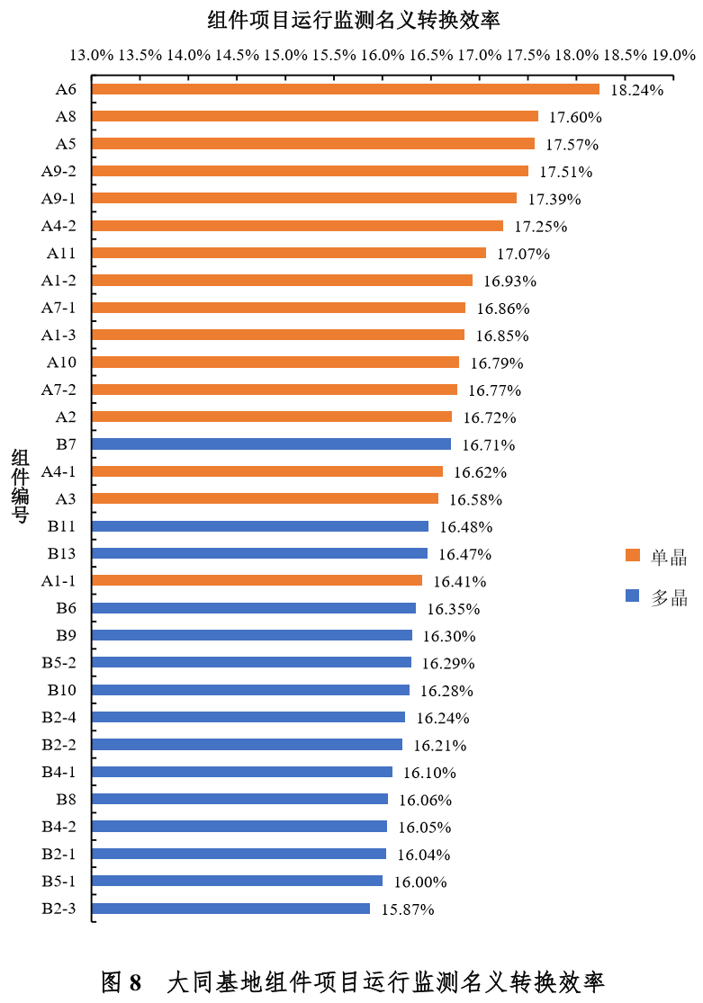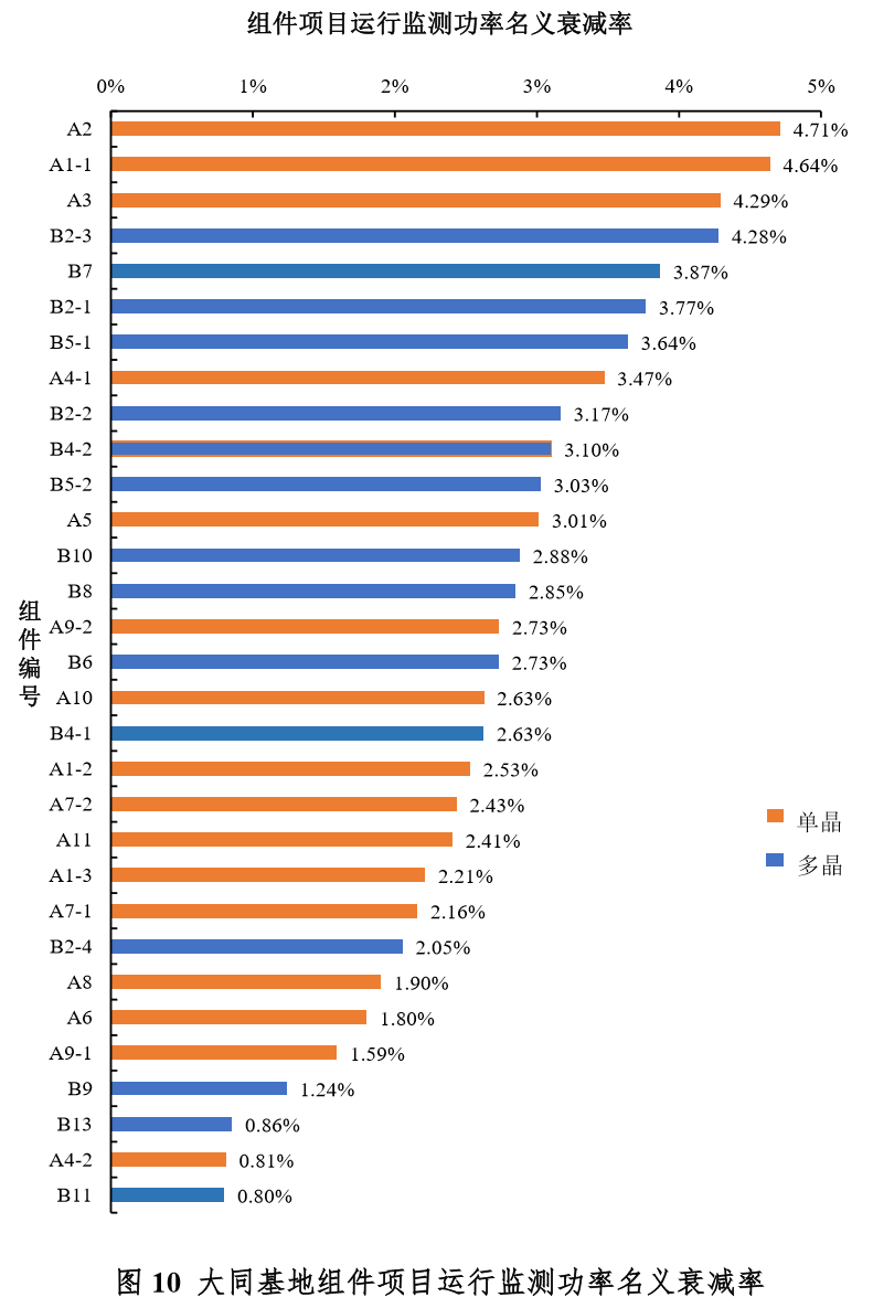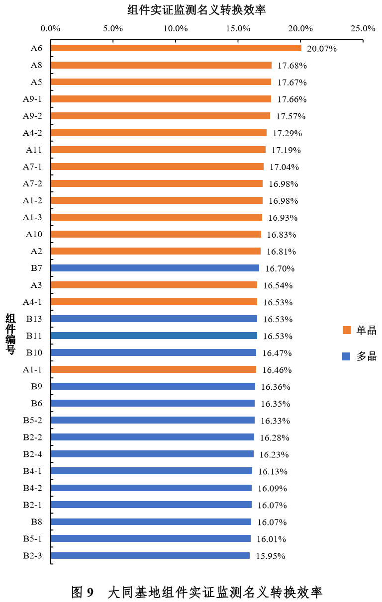 注:1.组件编号A12(中利腾晖生产的TP660M-280单晶组件)、B3(日托生产的SPP275P60多晶组件)、B12(正泰生产的CHSM6612P-325)三种组件,因实际安装容量较小,监测运行和实证监测采集数据代表性不强,本报告未对这三种型号组件进行效率测算。