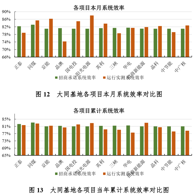 系统效率监测:本月大同基地各项目系统效率均值为82.17%,今年累计系统效率实测均值为80.75%,略低于81.38%的项目招商承诺首年系统效率均值。考虑到大同基地并网运行进入第三年,系统效率有所降低是正常现象,降低幅度在合理范围内。