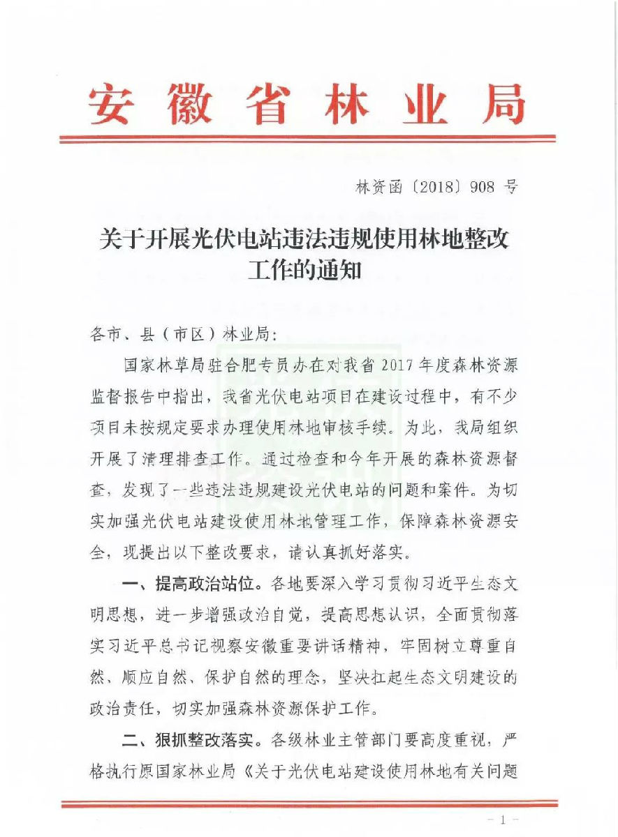 近日,安徽省林业局印发《关于开展光伏电站违法违规使用林地整改工作的通知》,指出安徽省光伏电站项目在建设过程中,有不少项目未按规定要求办理使用林地审核手续。为此,安徽省林业局组织开展清理排查工作。