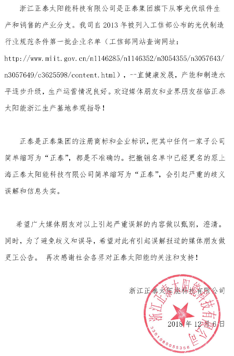 据了解,文中所述拟撤销名单中的原上海正泰太阳能科技有限公司属于正泰太阳能全资子公司,由于扩大产能需求,正泰太阳能对生产布局进行调整,原上海正泰太阳能科技有限公司厂址为租赁用地,容量有限,不能满足产能扩大需求,已于2016年9月完成整体搬迁。而原上海正泰太阳能科技有限公司现已在工商部门更名为“上海正泰新能源科技有限公司”,公司职能转为人才平台,不再继续承担生产职能,所以此次撤销属于正常操作。